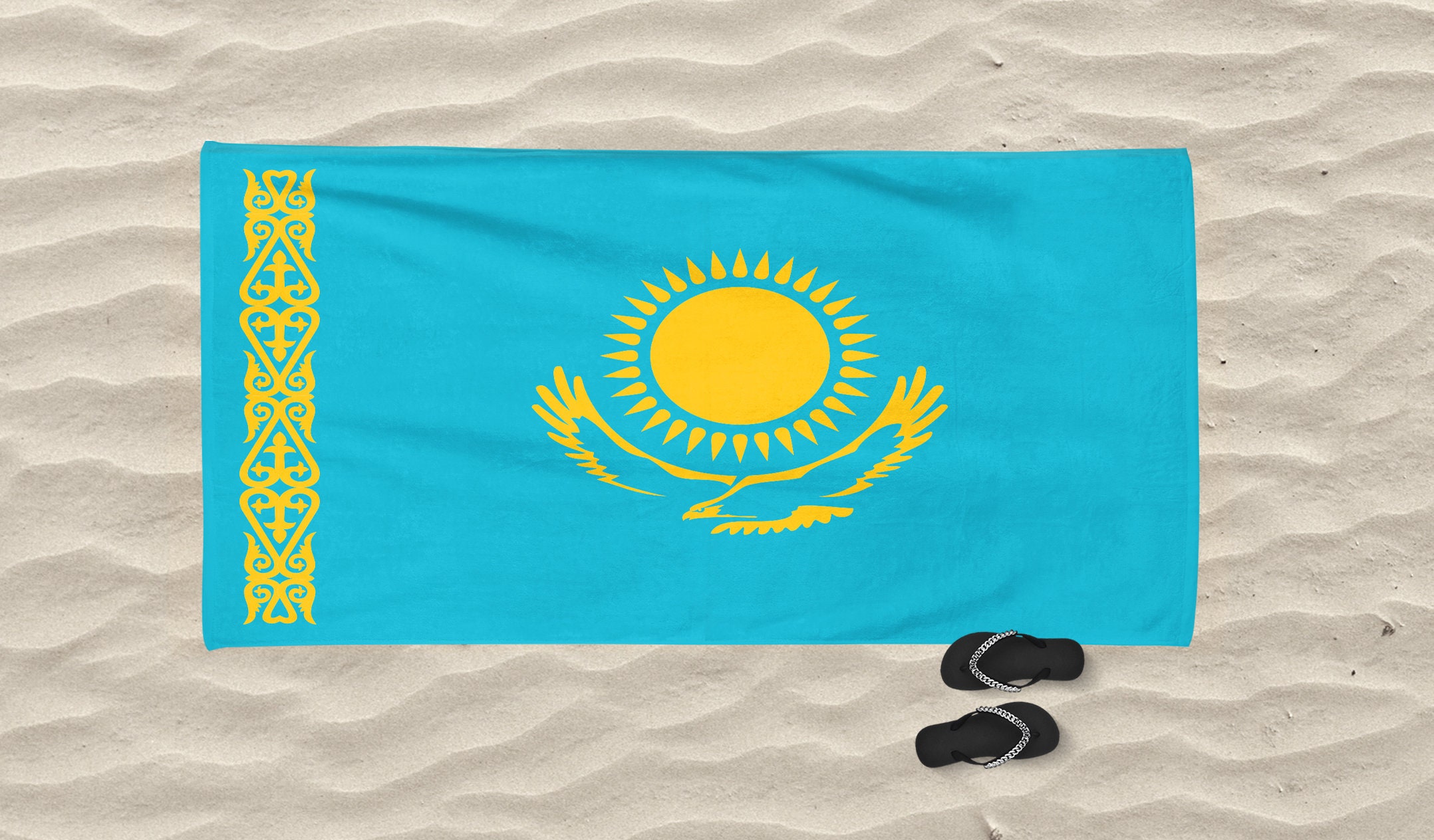 Zeig stolz deine Verbindung zu Kasachstan! Dieses coole Badetuch mit der kasachischen Flagge ist nicht nur ein Hingucker, sondern auch super praktisch. Hergestellt aus 100% Mikrofaser-Polyester saugt es Wasser mega schnell auf und trocknet im Nu.