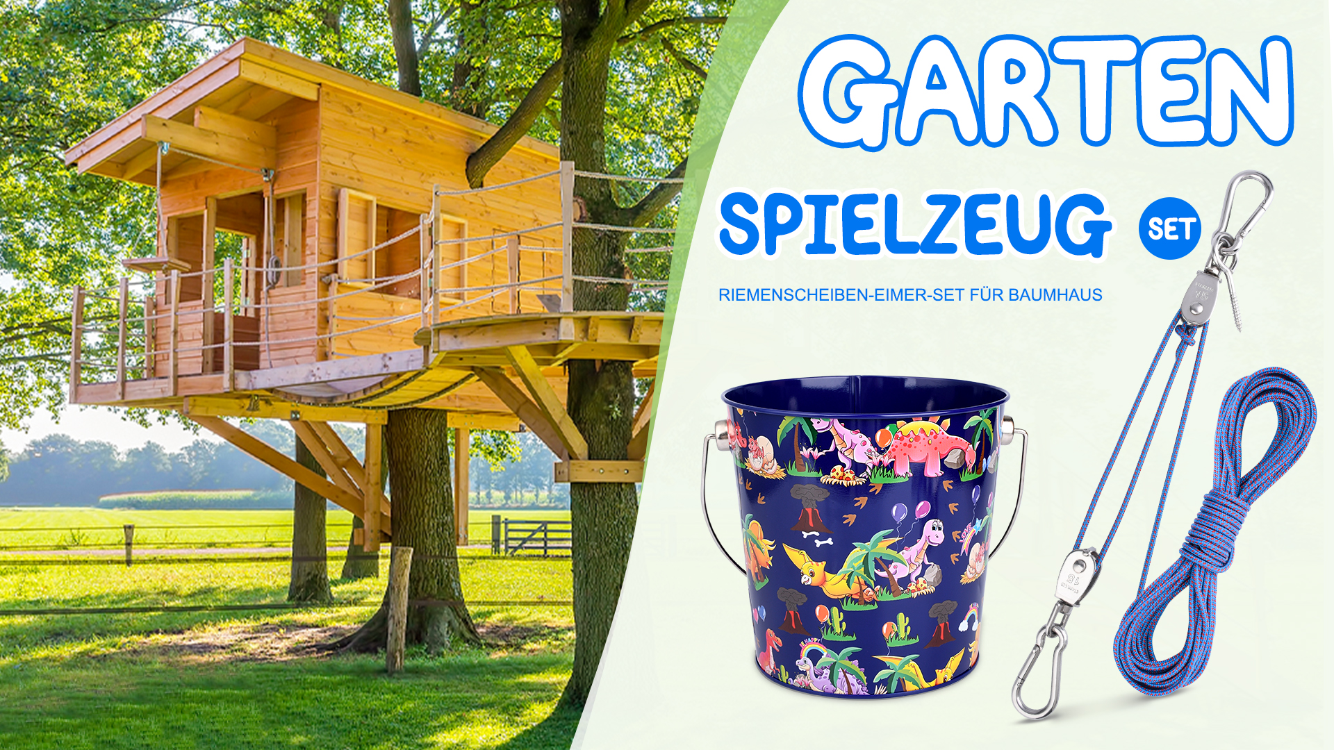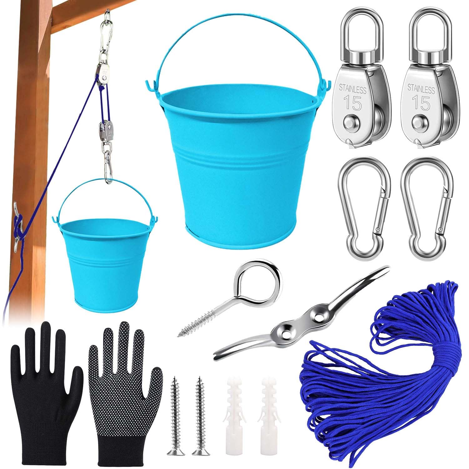 Was für cooles Spielzeug! Dieser Flaschenzug-Set macht jedem Kind Spaß. Mit Metall-Eimer, Seil und allem was man braucht um Sachen hochzuziehen.\n\nAus Edelstahl und Nylon - robust und sicher. Fördert motorische Fähigkeiten und kreatives Denken - lernen während dem Spielen!\n\nEinfach an nem stabilen Ast oder Baumhaus befestigen und schon können die Kids alles mögliche hochziehen. Perfekt für Kinder ab 3 Jahren.\n\nDas ideale Outdoor-Geschenk für Jungen und Mädchen - Stunden voller Spaß und Entdeckungen garantiert!
