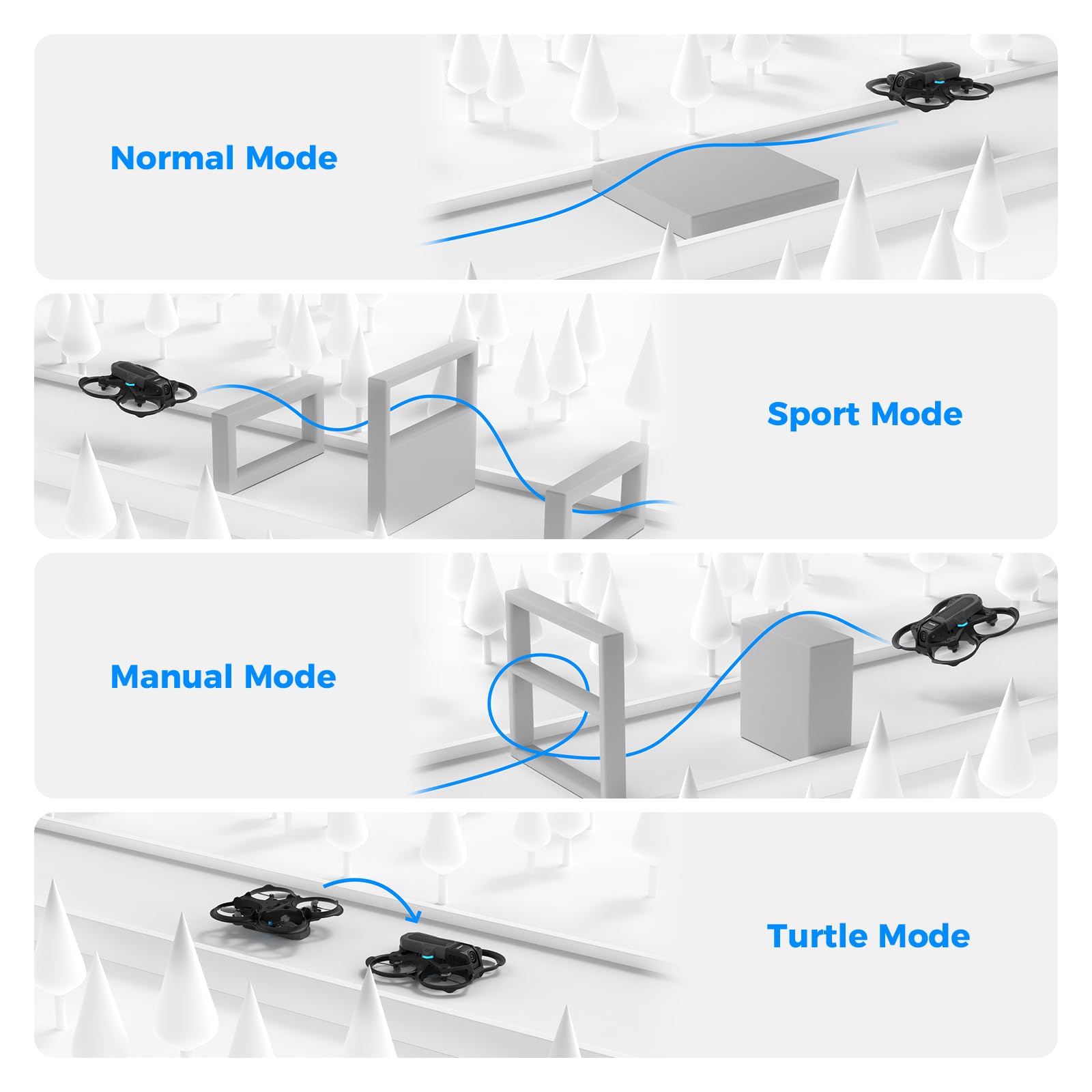Mit Höhenhaltung für stabilen Schwebeflug und Turtle-Mode für einfaches Aufrichten. Drei Flugmodi (Normal/Sport/Manual) passen sich deinem Können an.