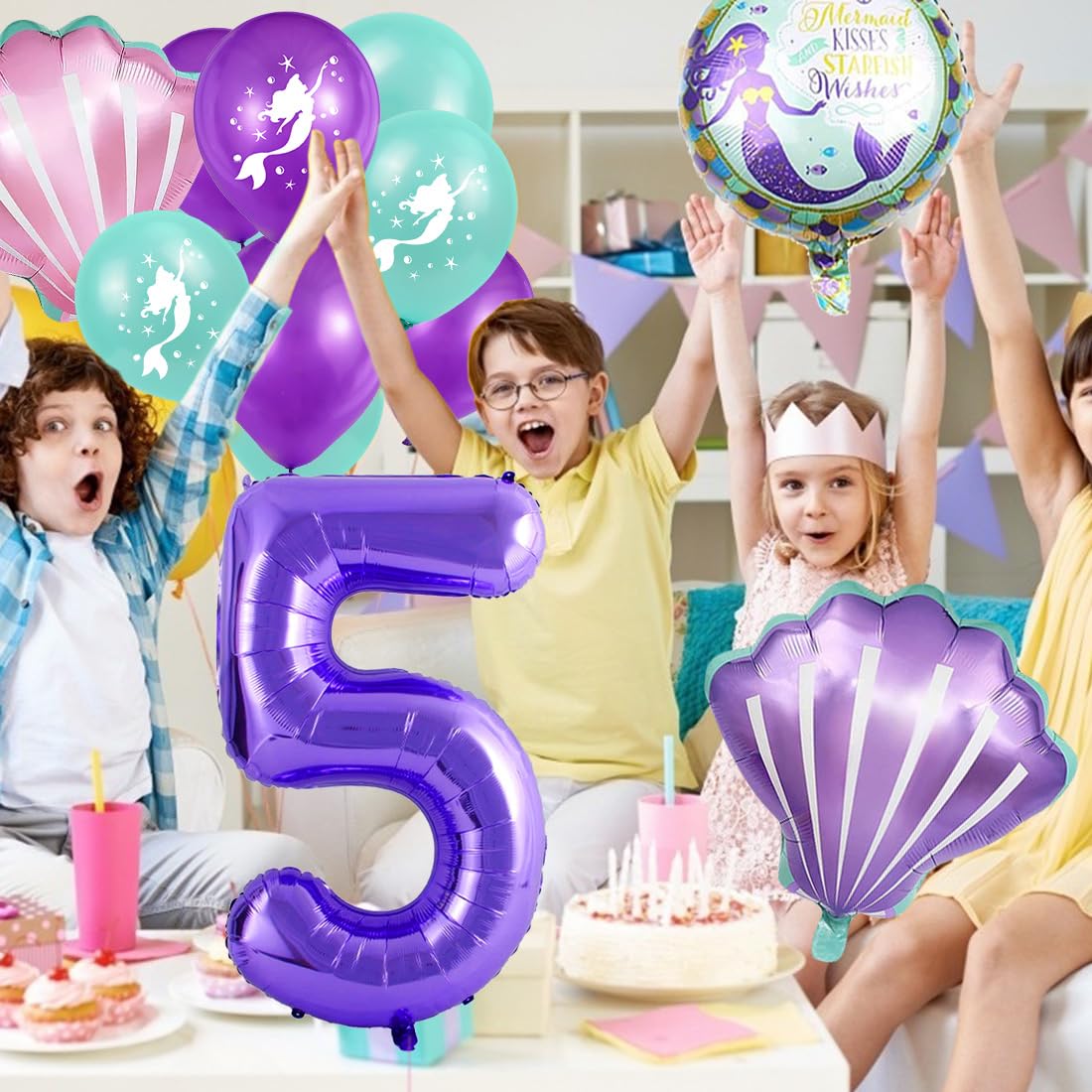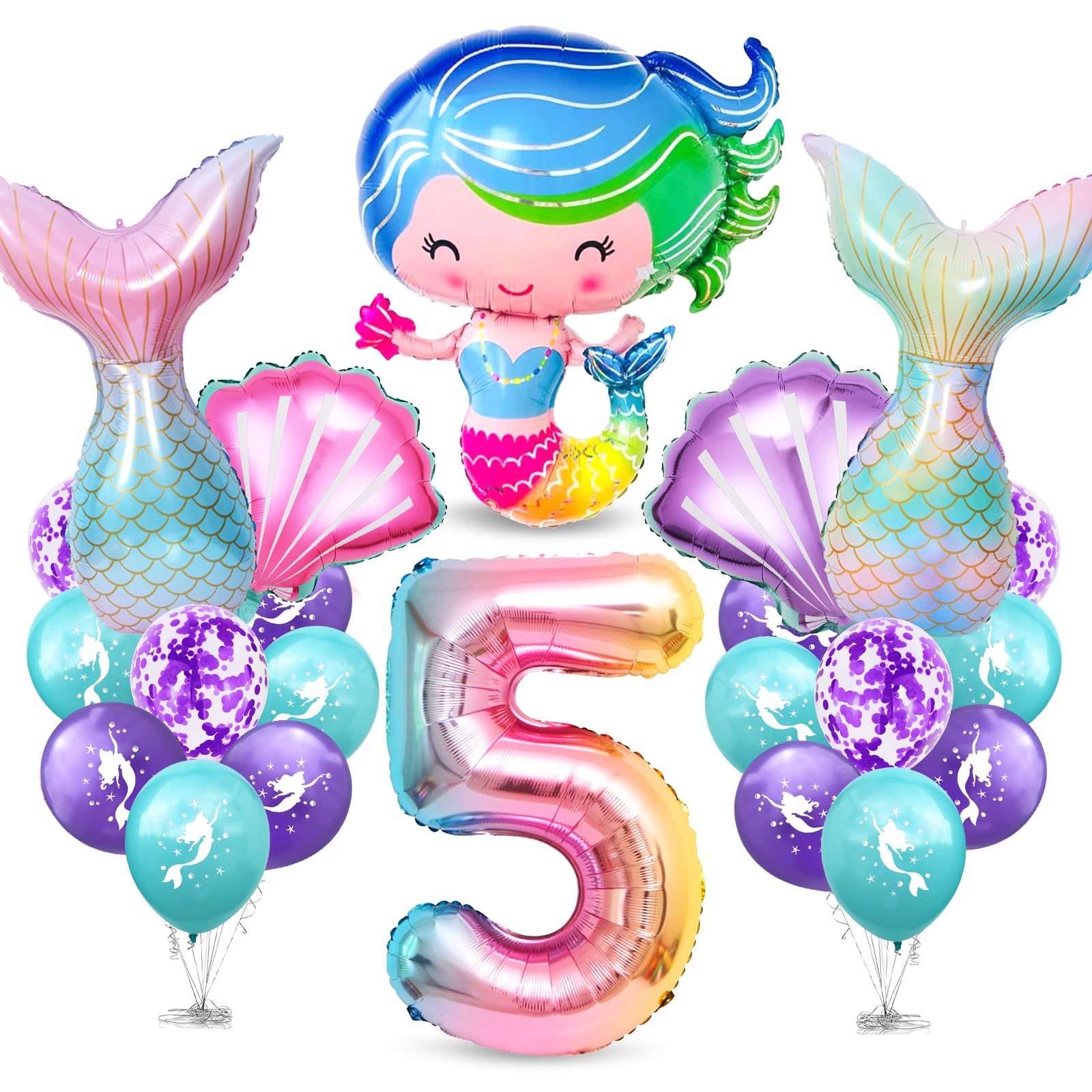 Tauch ein in eine magische Unterwasserwelt! Dieses zauberhafte Meerjungfrau-Deko-Set macht den 5. Geburtstag deiner kleinen Prinzessin zu einem unvergesslichen Erlebnis. \\n\\nIm Set enthalten: • 2x Meerjungfrau Folienballons (76x51 cm) • 2x Muschel Ballons (47x55 cm) • 1x Zahl 5 Ballon (80 cm) • 4x lila Konfetti Latexballons (30 cm) • 1x Ballonband \\n\\nAus hochwertiger Aluminiumfolie gefertigt, sind diese Ballons robust und können mit Helium oder Luft befüllt werden. Die wunderschönen Farbverläufe und glitzernden Details verzaubern jeden Raum! \\n\\nEinfach aufblasen (sie versiegeln sich automatisch), Band dran - und schon verwandelst du deine Party in ein märchenhaftes Unterwasserreich. \\n\\nAuch perfekt als Foto-Hintergrund oder für's Kinderzimmer. Ungiftig und absolut sicher für Kinder. \\n\\nHol dir die Magie des Meeres nach Hause - deine Kleine wird vor Begeisterung strahlen!
