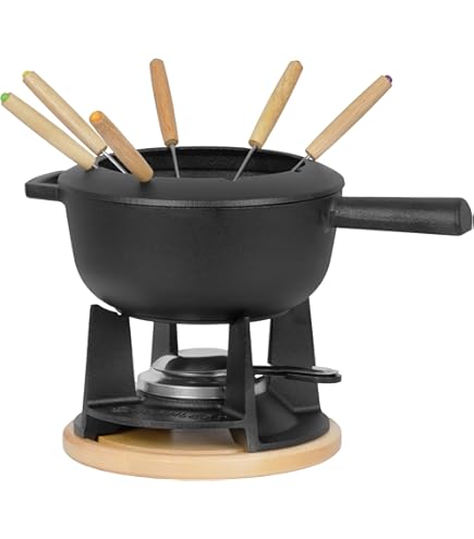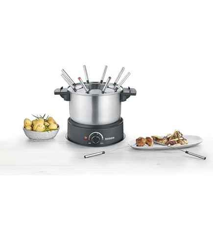 Gemütliche Fondue-Abende mit Freunden und Familie! Dieses komplette 20-teilige Set von Mäser enthält alles, was du für perfekte Fondue-Stunden brauchst: MDF-Platte, Rechaud, 2 Brenner, Fonduetopf, Spritzschutz, 4 Schälchen, 6 Fonduegabeln und 4 Fonduelöffel. Ideal für 6 Personen - ob Käsefondue, Fleisch oder Schokolade. Das elegante Design und die hochwertige Verarbeitung machen jedes Fondue zu einem besonderen Erlebnis. Einfach zu reinigen und platzsparend zu verstauen. Schaffe unvergessliche Momente bei Kerzenschein und gutem Essen - denn beim Fondue steht der gemeinsame Genuss im Mittelpunkt!