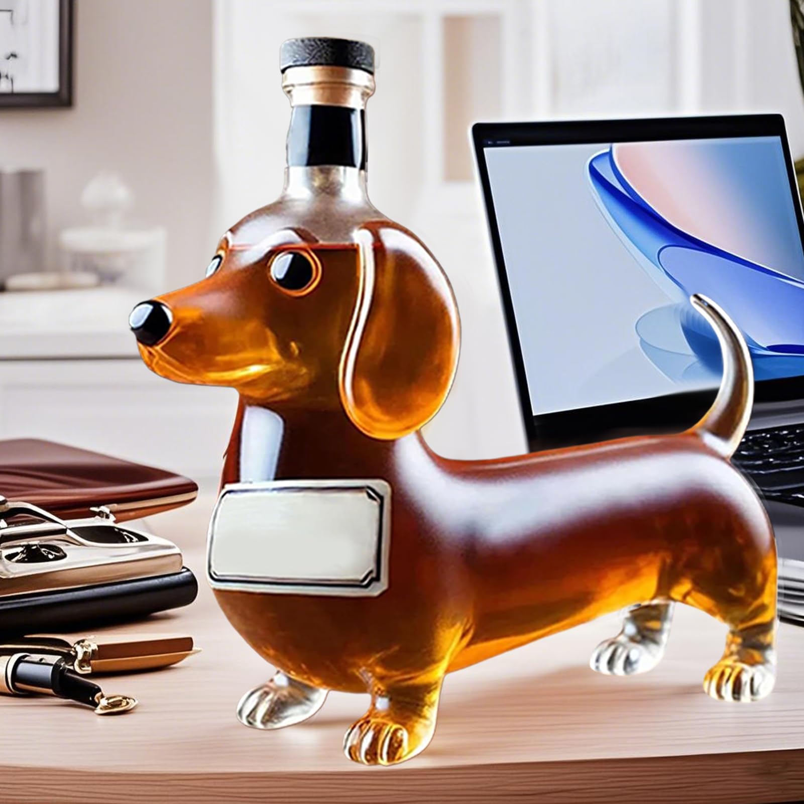 Wie süß ist das denn? Dieser Whiskey-Dekanter in Form eines Dackels bringt Lächeln in jede Bar! Das 3D-Design aus kristallklarem Glas zeigt jeden Detail des beliebten Hundes - perfekt um deinen Lieblingswhisky zu präsentieren. Nicht nur ein praktischer Dekanter, sondern auch ein tolles Deko-Stück für dein Zuhause oder Büro. Das ideale Geschenk für Hundeliebhaber, Whisky-Enthusiasten oder zum Vatertag. Dein Besuch wird begeistert sein! Einfach befüllen, ins Regal stellen und schon wird deine Heimbar zum echten Hingucker. Wer liebt nicht diese niedlichen Dackel - besonders wenn sie mit gutem Whisky gefüllt sind!
