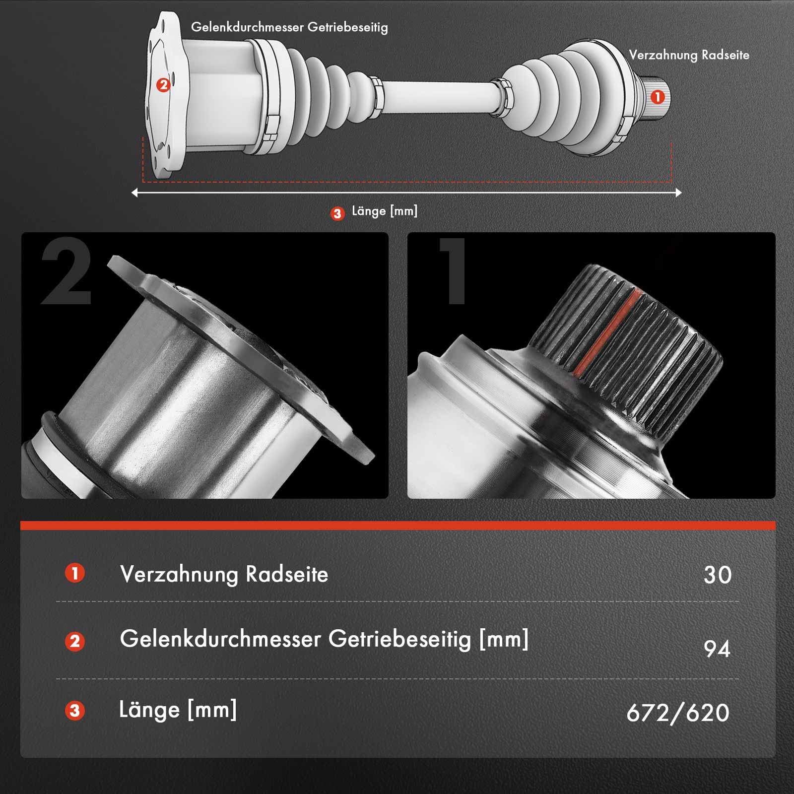 Passgenaue Antriebswelle für deinen BMW! Diese Frankberg Antriebswelle ersetzt originalgetreu die Nummer 33217561782 und ist kompatibel mit 3er Cabriolet E93 (2007-2013) und 3er Touring E91 (2005-2012) mit 1.6L-2.0L Motoren und Schaltgetriebe. WICHTIG: Nur für Fahrzeuge OHNE ABS-Ring! Vor dem Kauf unbedingt die Kompatibilität mit dem Amazon-Fit-Tool überprüfen - nur bei grüner 'Passt'-Meldung bestellen. Die Welle ist 672mm lang mit 94mm Durchmesser getriebeseitig und 30 Außenverzahnungen radseitig. Hergestellt aus hochfestem Stahl für maximale Belastbarkeit und Chloropren-Kautschuk für ausgezeichnete Verschleißfestigkeit. Einfacher Einbau an der Hinterachse rechts. Perfekte Lösung bei defekten Antriebswellen - bring deinen BMW wieder auf die Straße! Immer Getriebetyp und Fahrzeugdaten genau prüfen.