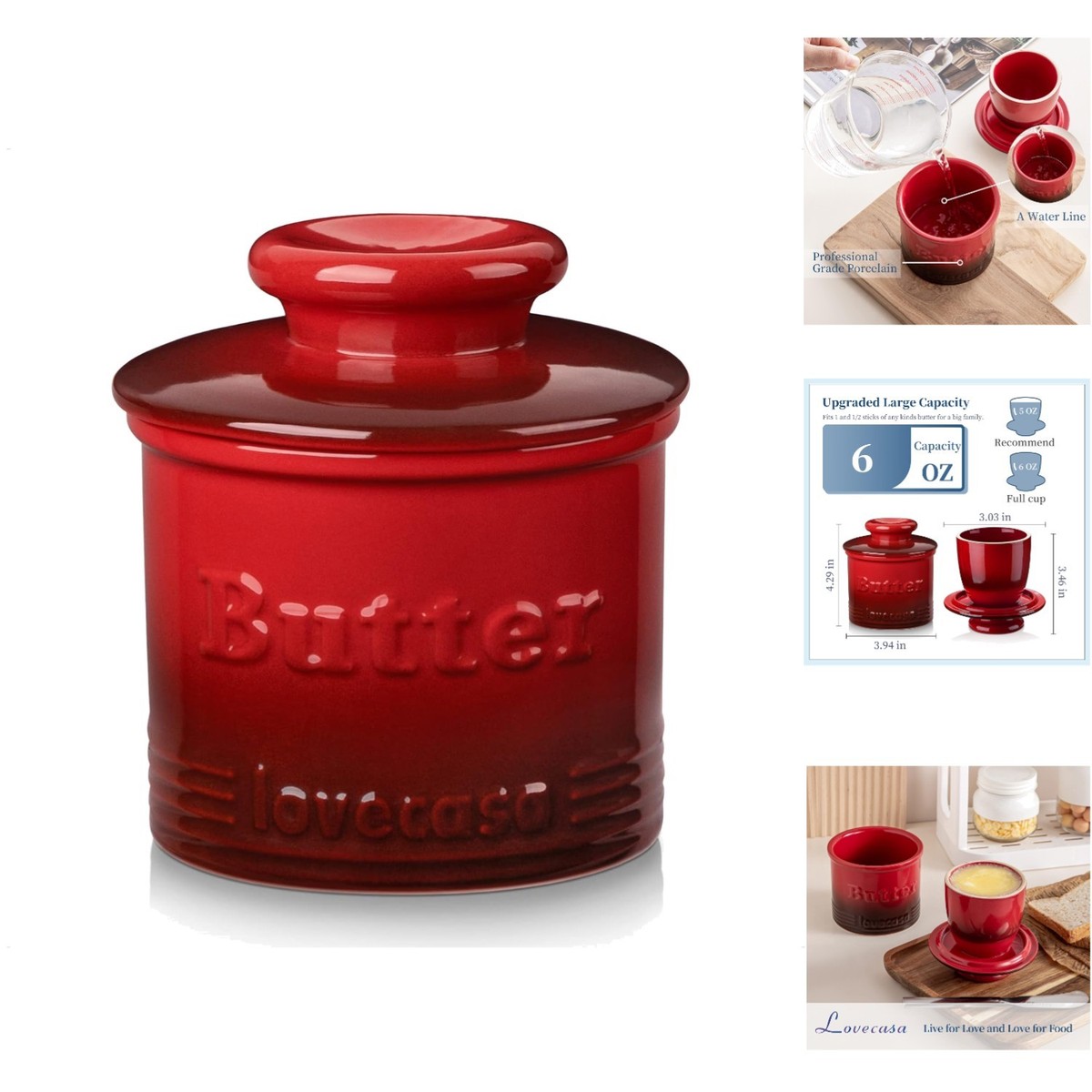 Nie wieder harte Butter! Diese traditionelle französische Butterdose aus Keramik hält deine Butter immer perfekt streichfähig - ganz ohne Kühlschrank. Das Geheimnis: Der Wasserverschluss! Einfach kaltes Wasser in den Boden füllen, die Butter in den Deckel geben und zusammensetzen. Das Wasser bildet eine luftdichte Barriere und die Butter bleibt wochenlang frisch und weich. Inklusive praktischem Buttermesser aus Edelstahl - alles in einem Set! Die Dose fasst etwa 1,5 Stück Butter und ist spülmaschinenfest. Das elegante Design in Rot macht sich super in jeder Küche. Perfekt für Brötchen am Morgen oder spontane Gäste. Ein geniales Stück Küchentradition, das wirklich funktioniert! Deine Butter ist immer bereit, wenn du sie brauchst.