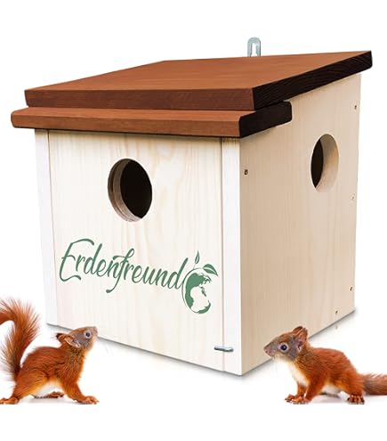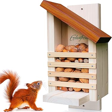 Einladung für niedliche Gartenbesucher! Dieses Eichhörnchen-Futterhaus aus Holz ist mit einem großen runden Fenster (18 cm Durchmesser) ausgestattet, durch das die Tiere leicht ein- und ausgehen können. Seitliche Lüftungslöcher sorgen für Luftzirkulation. Mit 33x17x24 cm bietet es viel Platz für Futter und ist wetterfest für den ganzjährigen Einsatz. Einfach an Bäumen oder Wänden montieren und den Eichhörnchen beim Naschen zusehen - ein Spaß für die ganze Familie!