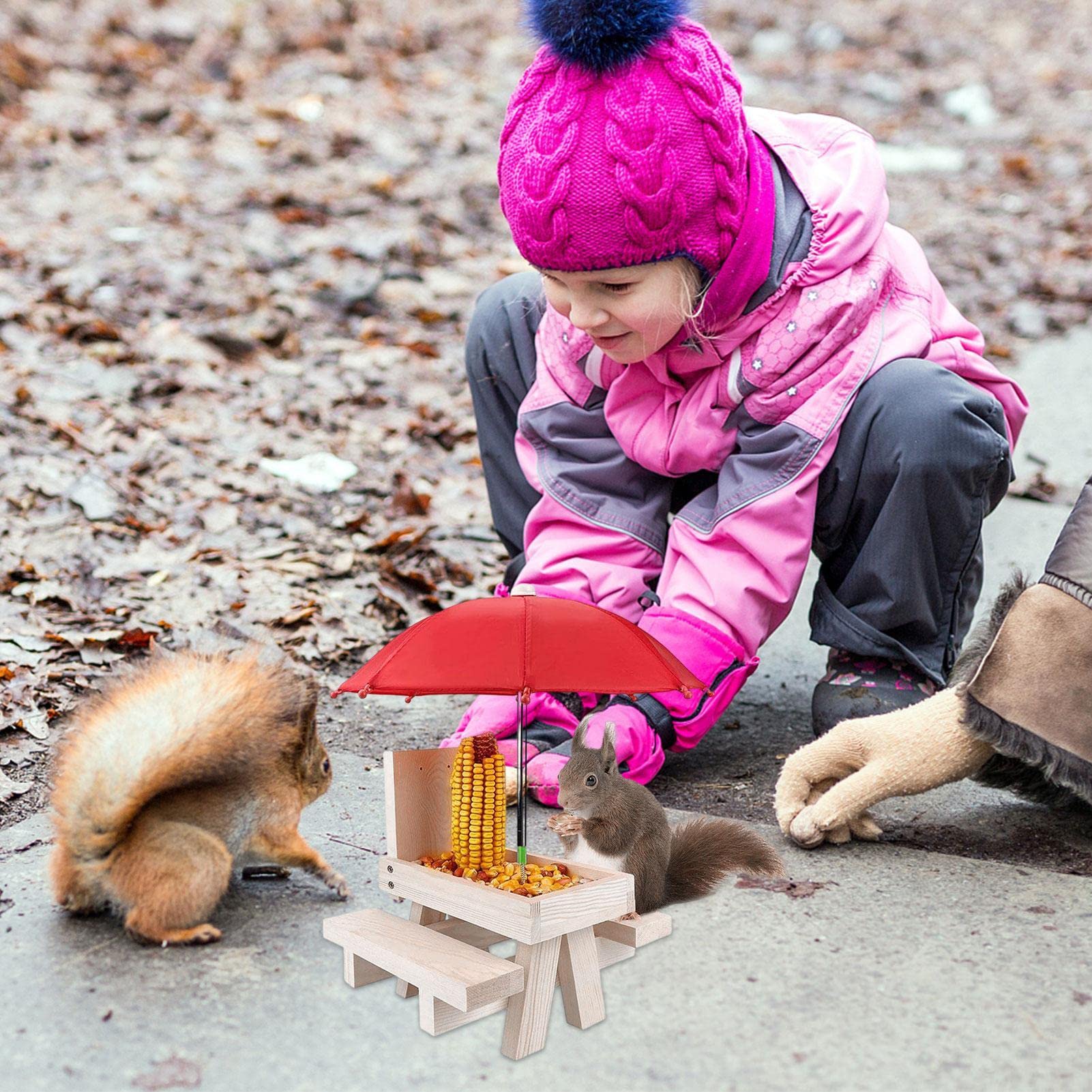 Beobachte niedliche Eichhörnchen in deinem Garten! Dieser Futtertisch aus Massivholz (21x18x18 cm) bietet zwei Sitzbänke für gleichzeitig zwei Tiere. Mit süßem rotem Regenschirm und Maiskolbenhalter. 1,5 cm tiefe Futterfläche verhindert Herunterfallen des Futters. Vorgebohrte Löcher für einfache Montage an Bäumen oder Zäunen. Inklusive 2 Erdspießen für Aufstellung im Rasen. Wetterfest und langlebig - ganzjährig nutzbar. Perfektes Geschenk für Tierliebhaber. Bring Leben in deinen Garten und genieße die possierlichen Besucher!