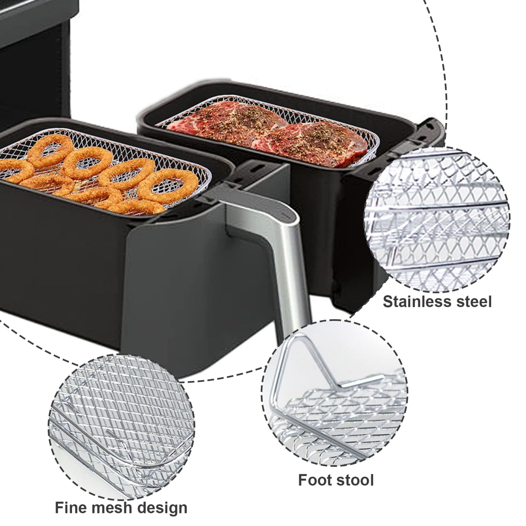 Mehr Platz in deiner Luftfritteuse? Kein Problem mit diesen praktischen Regalen von GOMETY! Das 3-stöckige Set aus lebensmittelechtem Edelstahl verdoppelt quasi deinen Kochraum - so kannst du mehrere Sachen gleichzeitig zubereiten. Pommes unten, Hähnchen oben und dazu noch etwas Gemüse? Easy! Die Regale sind stapelbar, benötigen keine Montage und passen perfekt in die meisten quadratischen Luftfritteusen von 5-8 Litern (wie COSORI, Gourmia, Tristar). Mitgeliefert werden 8 Silikonfüße zum Schutz deiner Fritteuse, eine Pinzette zum Wenden und eine Bürste zur Reinigung. Du kannst die Roste nicht nur in der Fritteuse, sondern auch im Backofen oder Dampfgarer verwenden - oder sogar zum Trocknen von Obst und Kräutern! Spülmaschinengeeignet sind sie auch. Ein echter Game-Changer für alle Luftfritteusen-Fans!