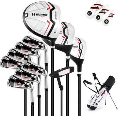All-in-One Golfset für Einsteigerinnen! Dieses 9-teilige Set enthält alles was du brauchst: 3 Hölzer (#1,3,4), 5 Eisen (#6,7,8,9,PW), 1 Putter plus Standtasche mit Regenschutz. Ultraleichte Grafitschäfte für einfache Schwünge. Die Tasche hat 11 Fächer und 6 Taschen für perfekte Organisation. In Rot/Schwarz - stylisch und funktional. Perfekt für den Einstieg oder als Upgrade für deine Ausrüstung!