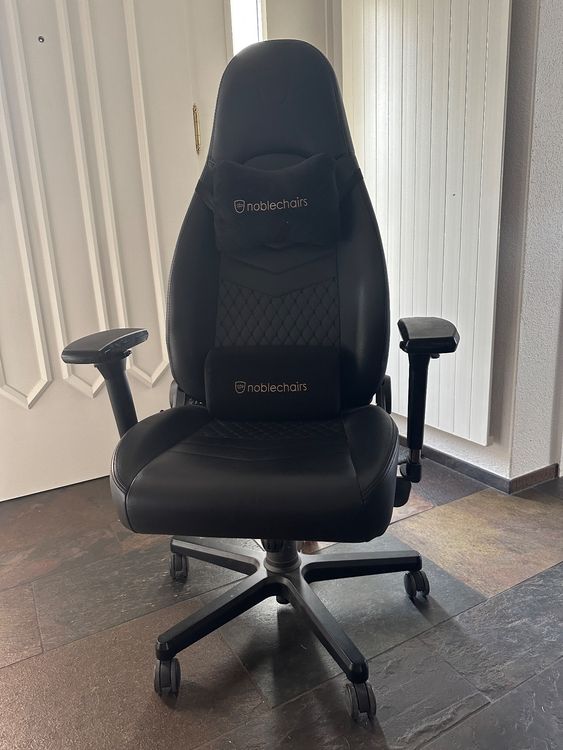 Dieser noblechairs ICON ist Gaming-Komfort pur! Bezogen mit genarbtem Echtleder in schwarz - luxuriös und langlebig. Mit 4D-Armlehnen in alle Richtungen verstellbar. Rückenlehne von 90° bis 135° neigbar + Wippfunktion (11°). Höhenverstellbare Gasfeder und komfortable Kopf-/Lendenkissen. Kaltschaumpolsterung mit 55% Raumgewicht - atmungsaktiv und formstabil. Stahlrahmen und Aluminium-Fußkreuz für 150kg Belastung. 60mm Rollen für alle Bodenarten. Inspiriert von Sportwagensitzen - ergonomisch perfekt. Für langes Zocken, Arbeiten oder Entspannen. Ein Thron für echte Gaming-Profis! Einfach verstellen und wohlfühlen.