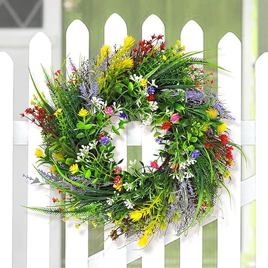 Dieser wunderschöne Türkranz bringt ganzjährig Frühlingsstimmung an deine Haustür! Mit 40x40cm Größe ist er der perfekte Blickfang. Die bunten Blüten in Rosa, Rot, Lila und Gelb kombiniert mit Eukalyptus-Blättern sehen täuschend echt aus.\\n\\nAus hochwertigem PP-Material, also wetterfest und langlebig. Egal ob Sonne, Regen oder Wind - dieser Kranz hält stand! Du kannst ihn nicht nur an der Haustür, sondern auch im Wohnzimmer, über dem Kamin oder an der Wand aufhängen.\\n\\nDas handgefertigte Design verleiht deinem Zuhause sofort diesen gemütlichen, einladenden Charme. Perfekt um Gäste willkommen zu heißen oder einfach um deine eigene Stimmung aufzuhellen.\\n\\nSuper als Geschenk für Haus-Einweihungen, Geburtstage oder Feiertage. Dieser Kranz begleitet dich durch alle Jahreszeiten und sorgt immer für fröhliche Farbtupfer! Einfach aufhängen und sich über die tolle Wirkung freuen.