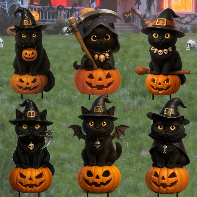 ILMFMY Halloween Gartendeko Katzen 6er Set - Schwarze Katzen Mit Hexenhut & Besen Für Garten