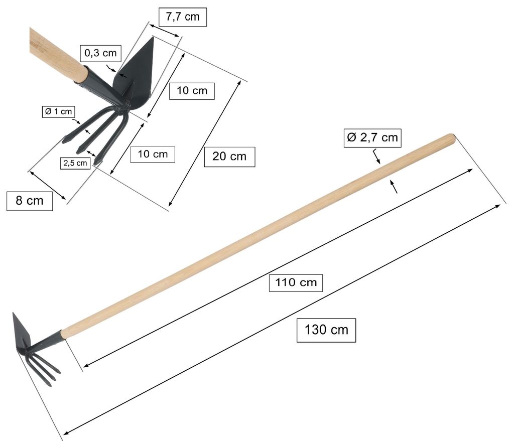 Für alle, die ihren Garten lieben! Diese praktische Doppelhacke mit 3 robusten Zinken ist dein bester Helfer im Beet. Vorne hacken, hinten lockern - zwei Werkzeuge in einem!\\n\\nAus hochwertigem Stahl mit lackiertem Kiefernholz-Griff. Länge 33cm - perfekt für präzises Arbeiten in kleinen Beeten. Macht das Jäten und Umpflanzen zum Kinderspiel.\\n\\nSuper für Hausgärten, Blumenbeete oder Gemüseanbau. Leicht zu reinigen, liegt gut in der Hand. Endlich ein Werkzeug, das wirklich hält, was es verspricht!