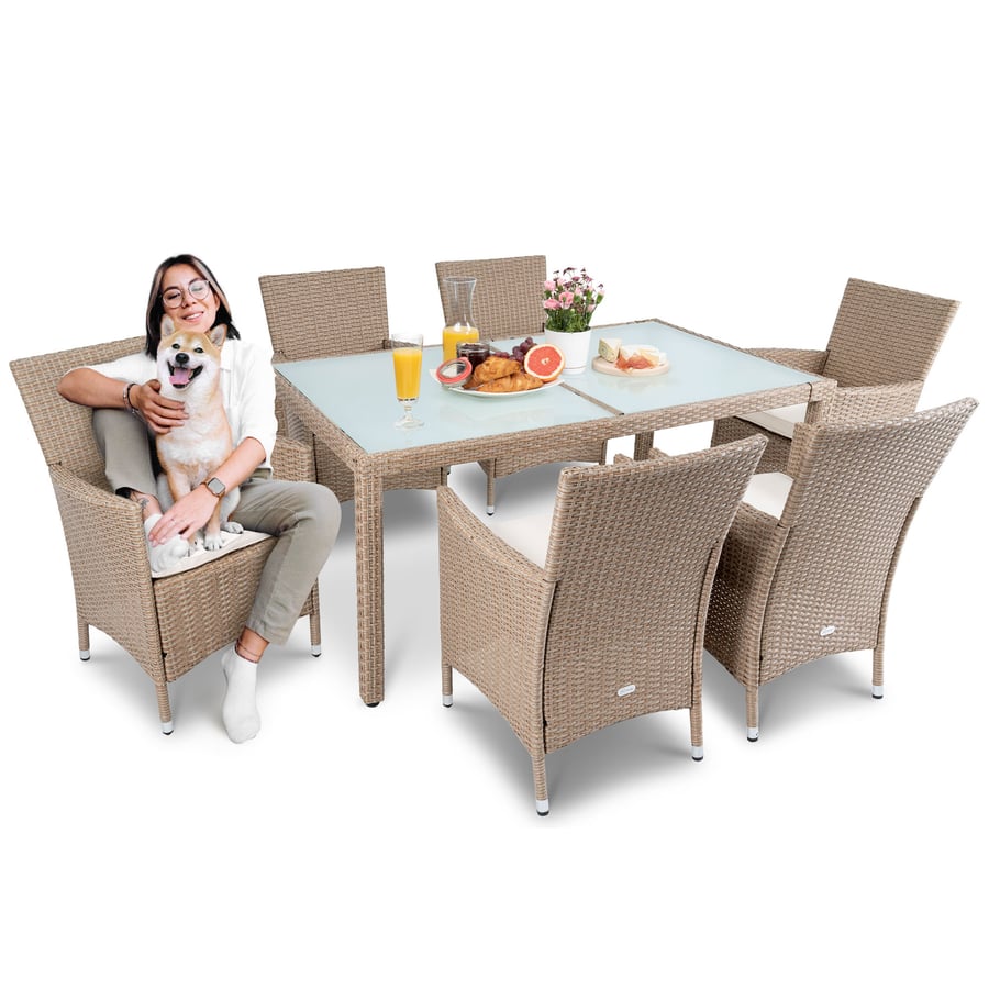 Traumhaft schönes Gartenmöbel-Set aus massivem Akazienholz! Das Groseto Set bringt echtes Wohnzimmer-Feeling in deinen Garten. Enthalten ist ein gemütliches Doppelsofa, zwei Sessel und ein runder Couchtisch - perfekt für gesellige Abende oder entspannte Nachmittage in der Sonne. Die extra dicken Kissen (20cm Sitz, 25cm Rücken) sind ein Traum an Komfort! Und praktisch: Die Bezüge sind wasser- und schmutzabweisend und mit Reißverschlüssen einfach abnehmbar. Das FSC-zertifizierte Akazienholz ist geölt und damit super wetterfest - Regen und Sonne machen diesem Set nichts aus. Das trendige Seilgeflecht gibt dem ganzen eine moderne Note. Der Tisch mit fast 80cm Durchmesser bietet genug Platz für Gläser, Snacks und Dekoration. Einfach hinstellen und dich jahrelang an diesem hochwertigen Set erfreuen!