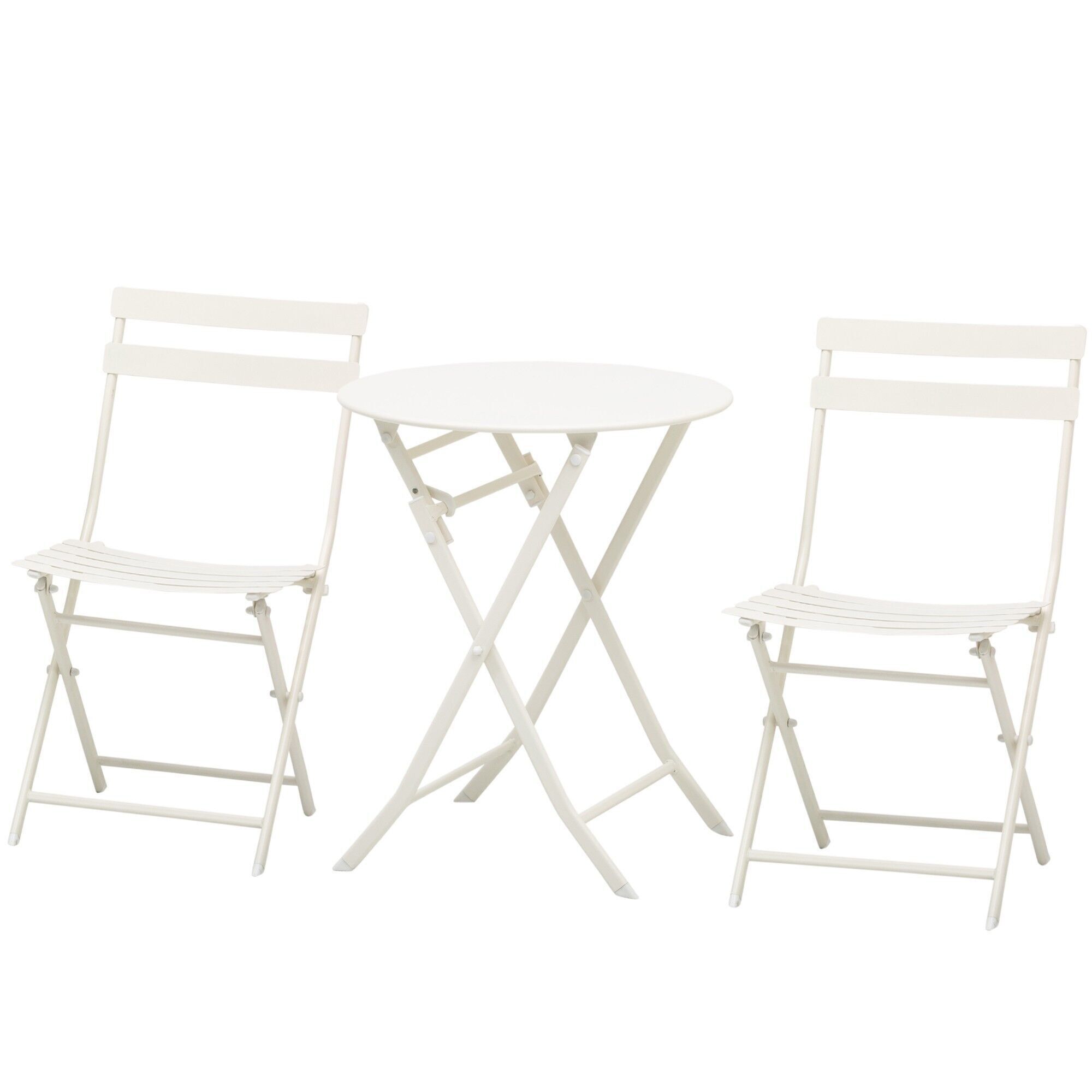Endlich gemütlich Kaffee trinken im Garten! Dieses süße Bistro-Set verwandelt deinen Balkon oder deine Terrasse in eine urige Café-Ecke.\\n\\n• Komplett-Set mit rundem Tisch und 2 Stühlen\\n• Tisch-Durchmesser: 60 cm, Höhe: 71 cm\\n• Robuste pulverbeschichtete Metallkonstruktion\\n• Rutschfeste Füße für sicheren Stand\\n• Praktisch zusammenklappbar für platzsparende Aufbewahrung\\n\\nDas Set kommt fertig montiert - einfach auspacken, aufklappen und schon kannst du deine erste Tasse Kaffee im Freien genießen! Der klassische französische Bistro-Stil sorgt für Urlaubsfeeling direkt vor der Haustür.\\n\\nPerfekt für kleine Balkone, Terrassen oder gemütliche Gartenecken. Wenn's mal regnet oder du Platz brauchst, klappst du das Set einfach zusammen und verstaukst es platzsparend. So einfach kann Gartengenuss sein! Einfach hinsetzen und entspannen - dein neues Lieblingsplätzchen wartet schon.