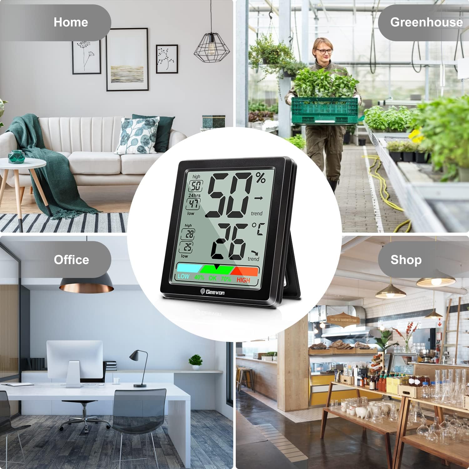 Du willst immer ein perfektes Raumklima haben? Mit dem Geevon Digitalen Hygrometer und Thermometer behältst du Temperatur und Luftfeuchtigkeit immer im Blick! Das Gerät misst die Temperatur von -40°C bis 70°C und die Luftfeuchtigkeit von 10% bis 99%. Alle 10 Sekunden werden die Werte aktualisiert, sodass du immer die aktuellsten Daten hast. Das große 2,5-Zoll-LCD-Display ist super easy abzulesen – auch aus der Entfernung. Besonders praktisch: Die Komfort-Anzeige signalisiert dir, ob die Bedingungen ideal sind. So kannst du rechtzeitig gegensteuern, um z.B. Schimmelbildung, trockener Haut oder Allergien vorzubeugen. Das Hygrometer wird mit zwei 3A-Batterien betrieben, die bis zu 24 Monate halten. Du kannst es auf drei Arten platzieren: als Tischständer, an der Wand (mit Aufhängebohrung) oder magnetisch am Kühlschrank. Achte darauf, es nicht in direkter Sonne oder near Heizungen zu platzieren, um genaue Messwerte zu garantieren. Perfekt für Zuhause, Büro, Gewächshaus oder Keller – für ein gesünderes und angenehmeres Raumklima!