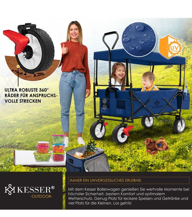 Der perfekte Begleiter für Familienausflüge! Dieser IMLEX Bollerwagen bietet Platz für bis zu 2 Kinder und hat eine stolze Traglast von 80kg. Die gefederten Räder sorgen für super bequemes Fahren - selbst auf unebenen Wegen. Das klappbare Dach schützt vor Sonne und Regen. Mit 120x70x110cm (aufgebaut) ist er geräumig, klappt aber platzsparend auf 68x20x88cm zusammen - passt also in fast jeden Kofferraum. Die drehbaren Vorderräder machen das Lenken super einfach, die Feststellbremse sorgt für sicheren Stand. Die hintere Hecktasche bietet zusätzlichen Stauraum. Ob für den Strand, Festival oder Stadtbummel - dieser Bollerwagen macht jeden Ausflug zum entspannten Erlebnis!