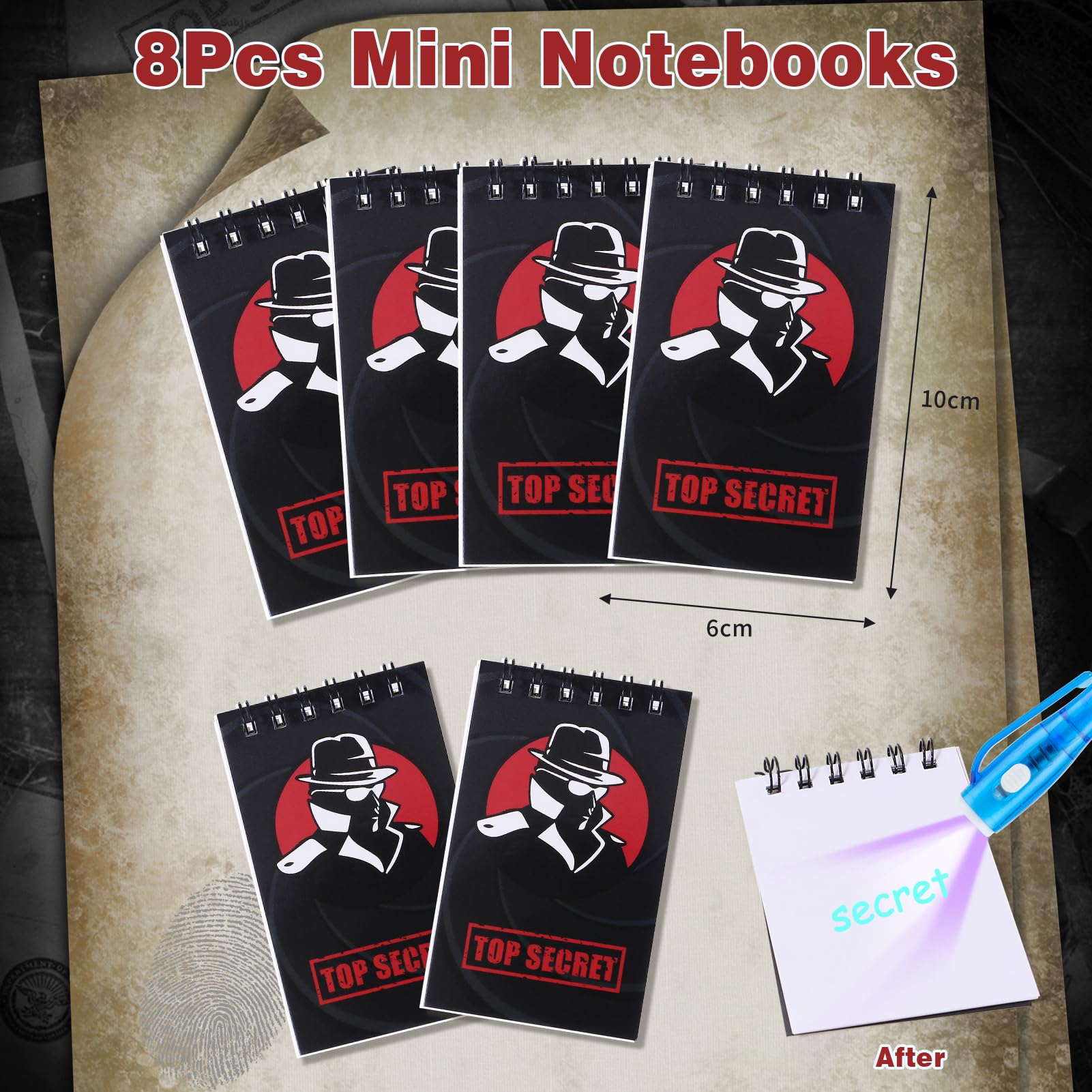 Im Set sind 8 UV-Stifte mit denen man unsichtbare Geheimbotschaften schreiben kann, 8 Mini-Notizbücher für die wichtigsten Ermittlungen, 8 TOP-SECRET Boxen, 8 schwarze Sonnenbrillen und 12 Schnurrbärte in 6 verschiedenen Styles.