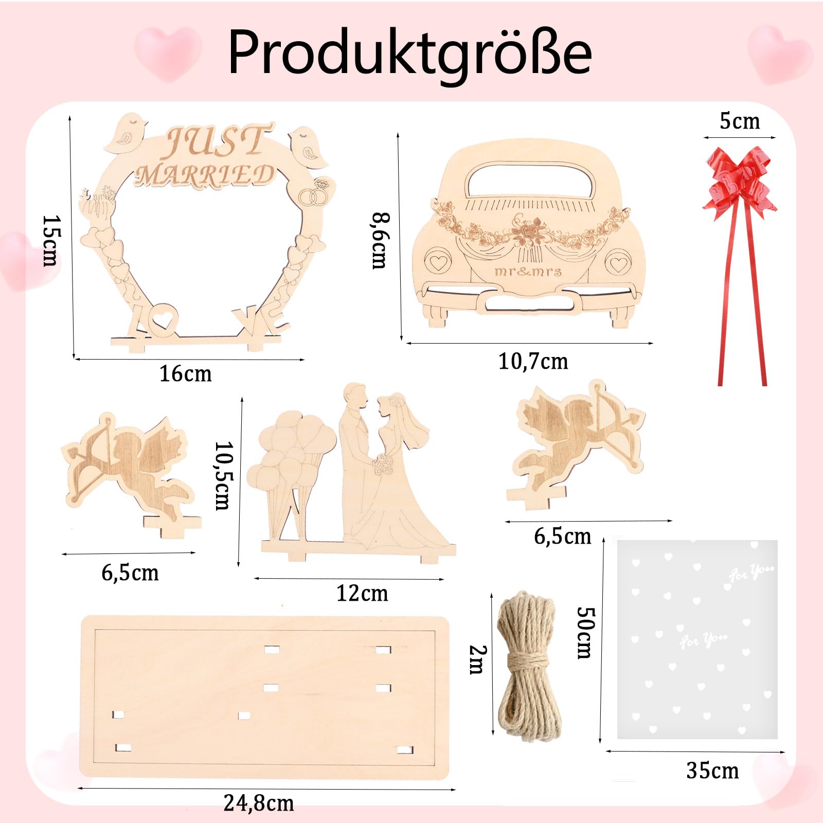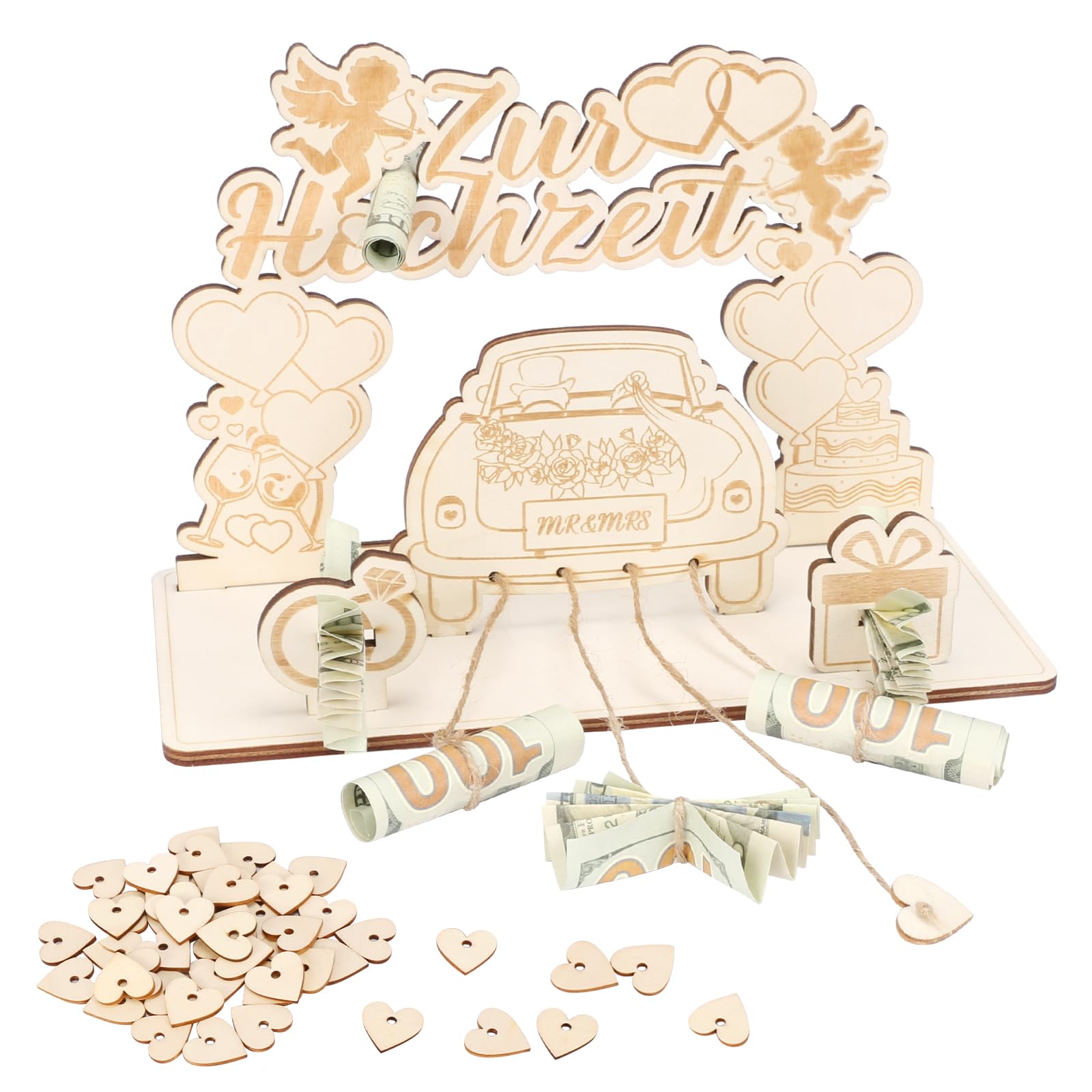 Wie schenkt man Geld zur Hochzeit stylisch? Mit diesem Holz-Geldgeschenk! Das farbige 3D-Motiv zeigt ein süßes Brautpaar das Händchen hält, mit der Aufschrift 'Mr & Mrs'. Im romantischen Blumenbogen-Design ist es nicht nur praktisch sondern auch ne tolle Deko für danach. Aus umweltfreundlichem Holz, natürlich und langlebig. Das Brautpaar kann es später als Erinnerung aufbewahren. Viel schöner als ein langweiliger Umschlag! Perfekt für Hochzeitsgäste die was Besonderes verschenken wollen.