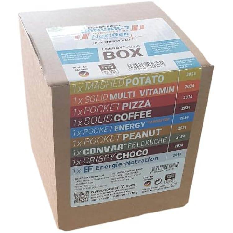 Diese Energy Bars von Convar-7 sind perfekt für unterwegs! Im Pack sind 9 Riegel à 120g - Pocket Pizza und Pocket Salami Geschmack. Hergestellt in Deutschland mit Qualitätszutaten: Weizenmehl, Palmfett, Haferflocken, Milcheiweiß und Reismehl. Super praktisch für Wanderungen, Camping oder als Notvorrat. Kannst du direkt essen oder als Brei mit heißem Wasser zubereiten - dann wird's wie eine richtige Mahlzeit. Die Riegel liefern Energie wenn du sie brauchst - ob beim Sport, auf Reisen oder im Beruf. Schmeckt gut und sättigt richtig. Perfekt für den Emergency-Kit oder einfach als schneller Snack für zwischendurch. Deutsche Qualität, auf die du dich verlassen kannst!