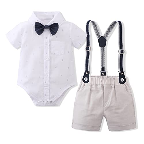 So niedlich war dein kleiner Gentleman noch nie! Dieses 3-teilige Anzug-Set für Babyjungen besteht aus einem Kurzarm-Strampler mit Fliege, einer modischen Shorts und verstellbaren Hosenträgern. Aus weichem Polyester-Baumwolle-Gemisch, super bequem und atmungsaktiv. Der Strampler hat praktische Druckknöpfe im Schritt für einfachen Windelwechsel. Das süße Design mit Umlegekragen und Fliege macht jeden kleinen Jungen zum stilvollen Gentleman. Perfekt für besondere Anlässe wie Taufen, Hochzeiten, Geburtstage, Weihnachten oder Fototermine. Die Shorts mit elastischem Bund und seitlichen Taschen, combined mit den Y-Rücken-Hosenträgern, sieht einfach klasse aus. Ein ideales Geschenk für werdende oder frischgebackene Eltern. Dein Kleiner wird der Star jeder Feier!