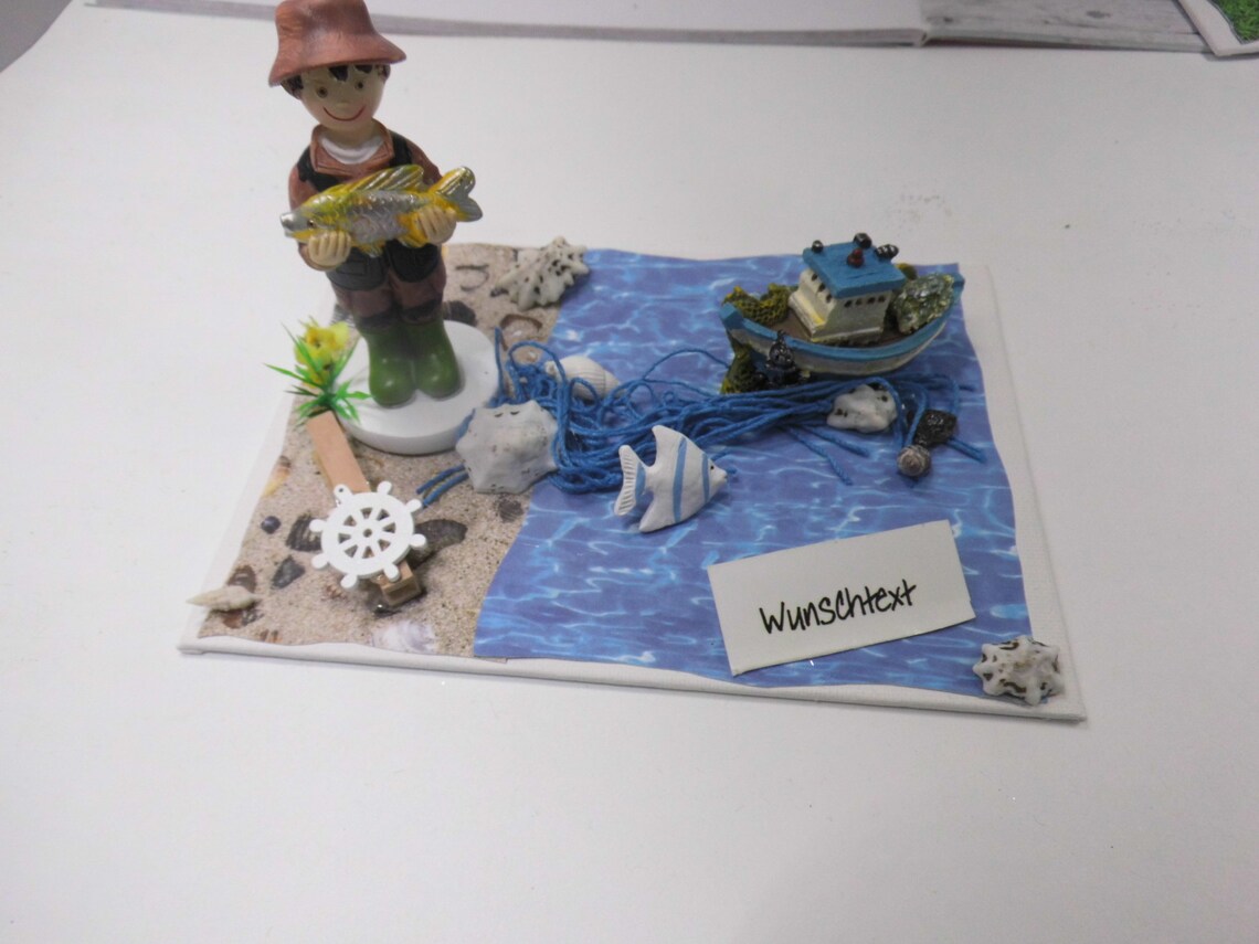 Alles dabei: Ein Angler mit Fisch, Grasmatte, Farn, Holzstücke und ein Hintergrundbild. Einfach den Geldschein an der Klammer befestigen und fertig ist das perfekte Geschenk!