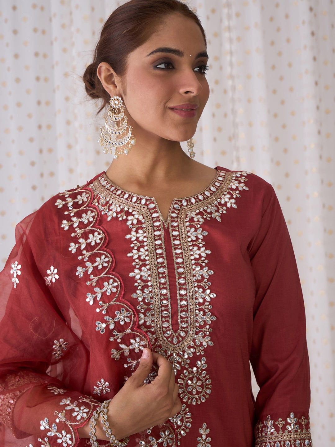 Das Kurta hat eine wadenlange, gerade Passform mit Dreiviertelärmeln und Rundhalsausschnitt. Die Stickereien sind fein gearbeitet und geben dem Outfit einen luxuriösen Touch.