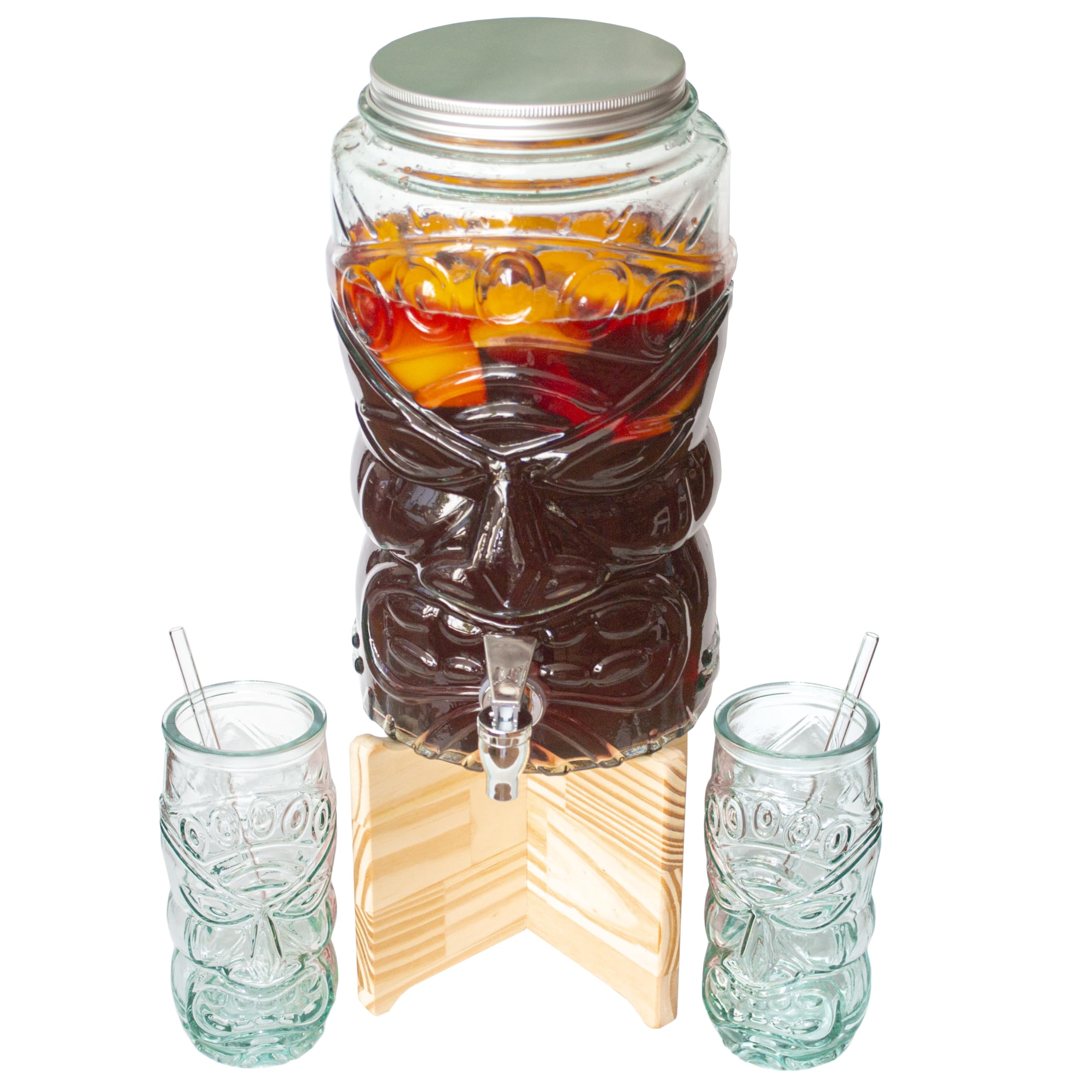Party-Time mit Style! Dieser coole Getränkespender aus 100% recyceltem Glas macht jede Feier zum Hit. Mit 4 Litern Fassungsvermögen ist er perfekt für Sangria, Cocktails, Säfte oder Bier. Im Set inklusive: 2 passende 450ml Gläser, 2 Glas-Strohhalme und ein praktischer Holzständer. Hergestellt in Spanien mit Nachhaltigkeits-Fokus. Der Zapfhahn macht das Ausschenken super einfach - kein Kleckern mehr! Einfach zu montieren und zu reinigen. Perfekt für Gartenpartys, Geburtstage oder gemütliche Abende mit Freunden. Dein neuer Liebling für gesellige Stunden!
