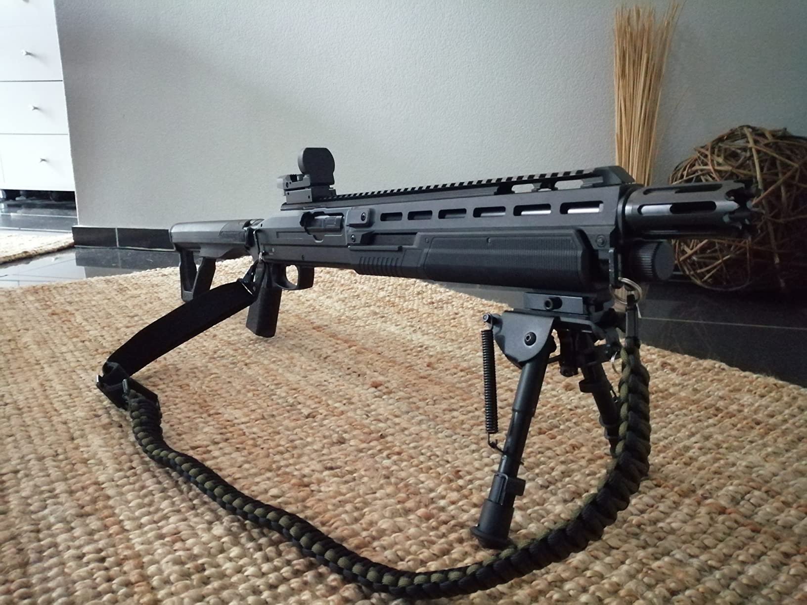 Dieser Gewehrgurt ist echt was Besonderes! Aus hochwertigem 550 Paracord handgefertigt, ist er nicht nur super stabil, sondern auch ein echtes Survival-Tool. Mit den US-amerikanischen Drehgelenken aus Metall dreht sich deine Waffe immer perfekt mit - keine billigen Plastikteile die brechen können! Der Gurt ist von 76cm bis 122cm verstellbar und hat eine Breite von 2,5cm. Das coole Rot-Schwarz-Design sieht an jedem Gewehr einfach klasse aus. Und falls du mal in der Klemme steckst: Das Paracord kannst du im Notfall auftrennen und für alles Mögliche verwenden - ob fürs Angeln, als Schnur oder für ne Notfallschiene. Mit 550 Pfund Belastbarkeit hält das Ding wirklich alles aus. Ein Gurt fürs Leben, der nicht nur gut aussieht, sondern im Ernstfall auch dein Retter sein kann!