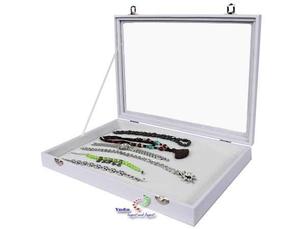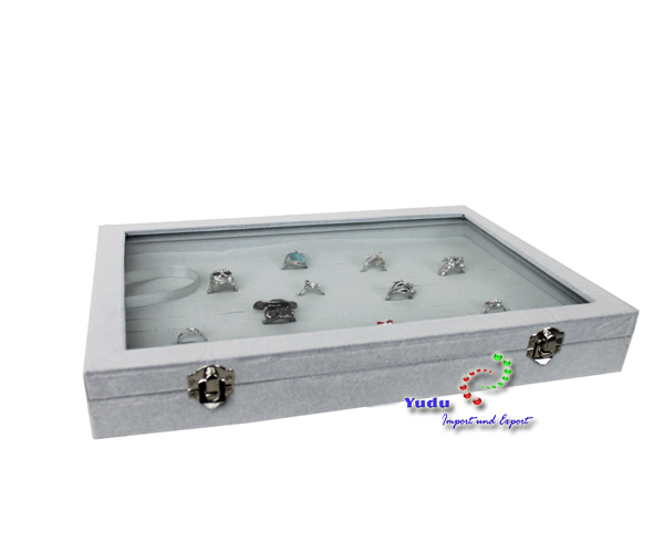 Endlich Ordnung im Schmuckkästchen! Dieser tolle Schmuckkasten mit Glasdeckel ist perfekt für alle, die ihre Schätze sicher und schön aufbewahren wollen. Mit 11 Haken speziell für Ketten - nichts verheddert sich mehr! Der graue Samt innen und außen schützt vor Kratzern und sieht total edel aus. Maße: 35x24x4,3 cm - passt super in jede Schublade oder auf den Schminktisch. Der Glasdeckel schützt vor Staub und man kann alles schön sehen. Besonders praktisch: Die Kästen sind stapelbar! Super für die Ladentheke oder zu Hause, wenn man mehrere hat. Einfach den Deckel aufklappen, Schmuck rausnehmen oder reinlegen, fertig. Macht auch als Geschenk eine super Figur!