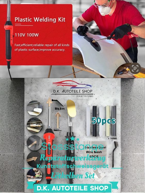 Risse und Brüche in Kunststoffteilen? Mit diesen glatten Schweißköpfen reparierst du sie professionell! Das 5-teilige Set ist der perfekte Helfer für alle Kunststoff-Reparaturen in Werkstatt und Garage. \\n\\nDas geniale 45-Grad-Ellenbogen-Design ermöglicht präzises Arbeiten auch an schwer zugänglichen Stellen. Die offene Schnallen-Schnittstelle macht die Köpfe mit verschiedenen Schweißwerkzeugen kompatibel. \\n\\nTechnische Daten: \\n- Material: Hochwertiges Metall \\n- Farbe: Silber \\n- Größe: ca. 50x20x5mm \\n- 45-Grad-Design für bessere Erreichbarkeit \\n\\nEinsatzgebiete: \\n- Auto-Stoßstangen Reparatur \\n- Kunststoffschalen hinter Scheinwerfern \\n- Motorrad-Innenverkleidungen \\n- PP-Kunststoffrohre \\n- Waschmaschinen-Innentrommeln \\n- Verschiedene PP-Kunststoffteile \\n\\nVorteile: \\n- Einfache Installation am Schweißgerät \\n- Schnelle und effiziente Reparaturen \\n- Verstellbar für verschiedene Werkzeuge \\n- Robuste Metall-Ausführung \\n- Vielseitig einsetzbar \\n\\nOb für die Auto-Werkstatt, Motorrad-Pflege oder Haushaltsreparaturen - mit diesen Schweißköpfen machst du kaputte Kunststoffteile wieder wie neu. Ein unverzichtbares Werkzeug für jeden, der Wert auf professionelle Reparaturen legt!