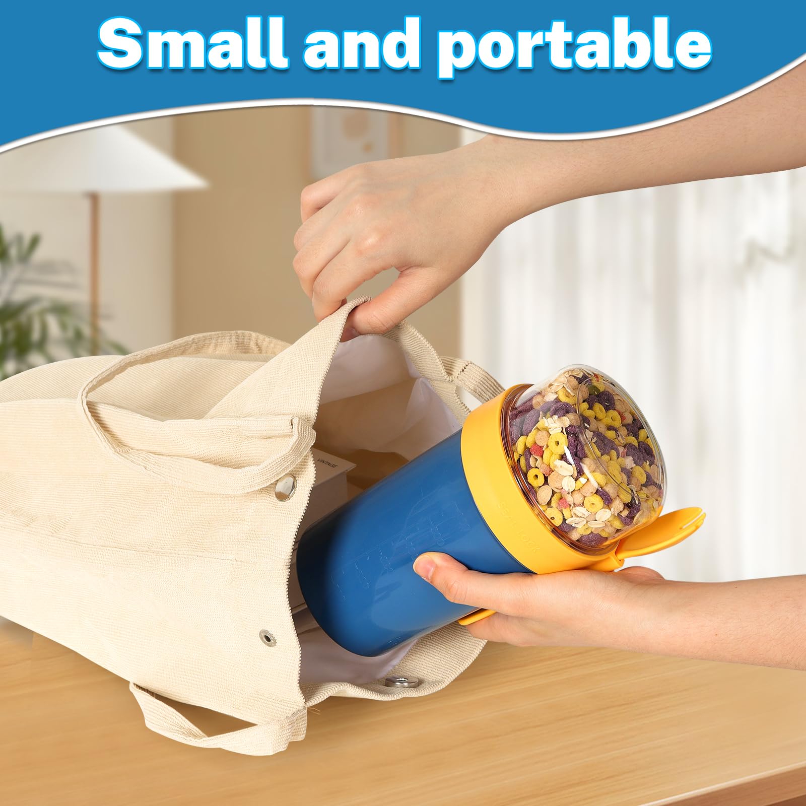 Frühstück to go war noch nie so praktisch! Dieser geniale 2-in-1-Becher hat zwei getrennte Fächer: unten 560ml für Joghurt, Milch oder Quark, und oben 360ml für Müsli, Früchte oder Nüsse. So vermischt sich alles erst, wenn du es willst - dein Müsli bleibt schön knusprig! Der integrierte Dip-Behälter ist perfekt für Soßen oder Toppings. Aus lebensmittelechtem PP-Material ohne BPA - also völlig unbedenklich. Der Dichtring sorgt dafür, dass nichts ausläuft, selbst wenn der Becher in der Tasche herumgeschleudert wird. Mit dem praktischen Griff trägst du ihn bequem, und der angebrachte Löffel ist immer griffbereit - kein Suchen mehr! Die transparente Hülle lässt dich sehen, was drin ist, und die Skala hilft beim Portionieren. Ob für die Schule, die Arbeit, Sport oder Reisen - mit diesem Becher genießt du überall ein frisches, gesundes Frühstück. Einfach befüllen, zuklappen und los geht's! Endlich kein matschiges Müsli mehr - sondern knuspriger Genuss, wann und wo du willst!