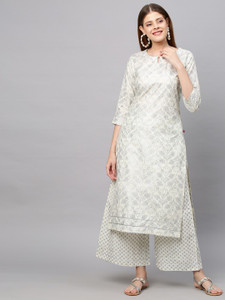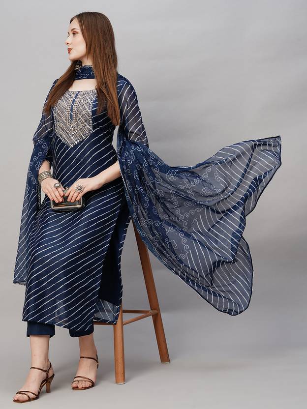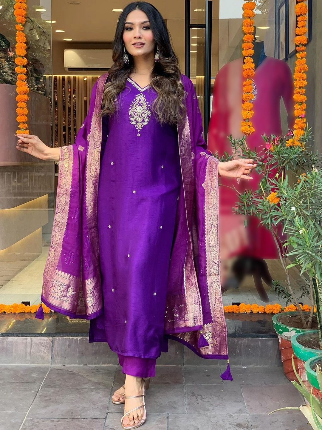 Im Set enthalten: Eine wunderschön bestickte Kurta mit 3/4-Ärmeln, eine trendige Hose und ein eleganter Dupatta-Schal. Der runde Ausschnitt und die gerade Silhouette sorgen für einen lässigen, aber stylischen Look.