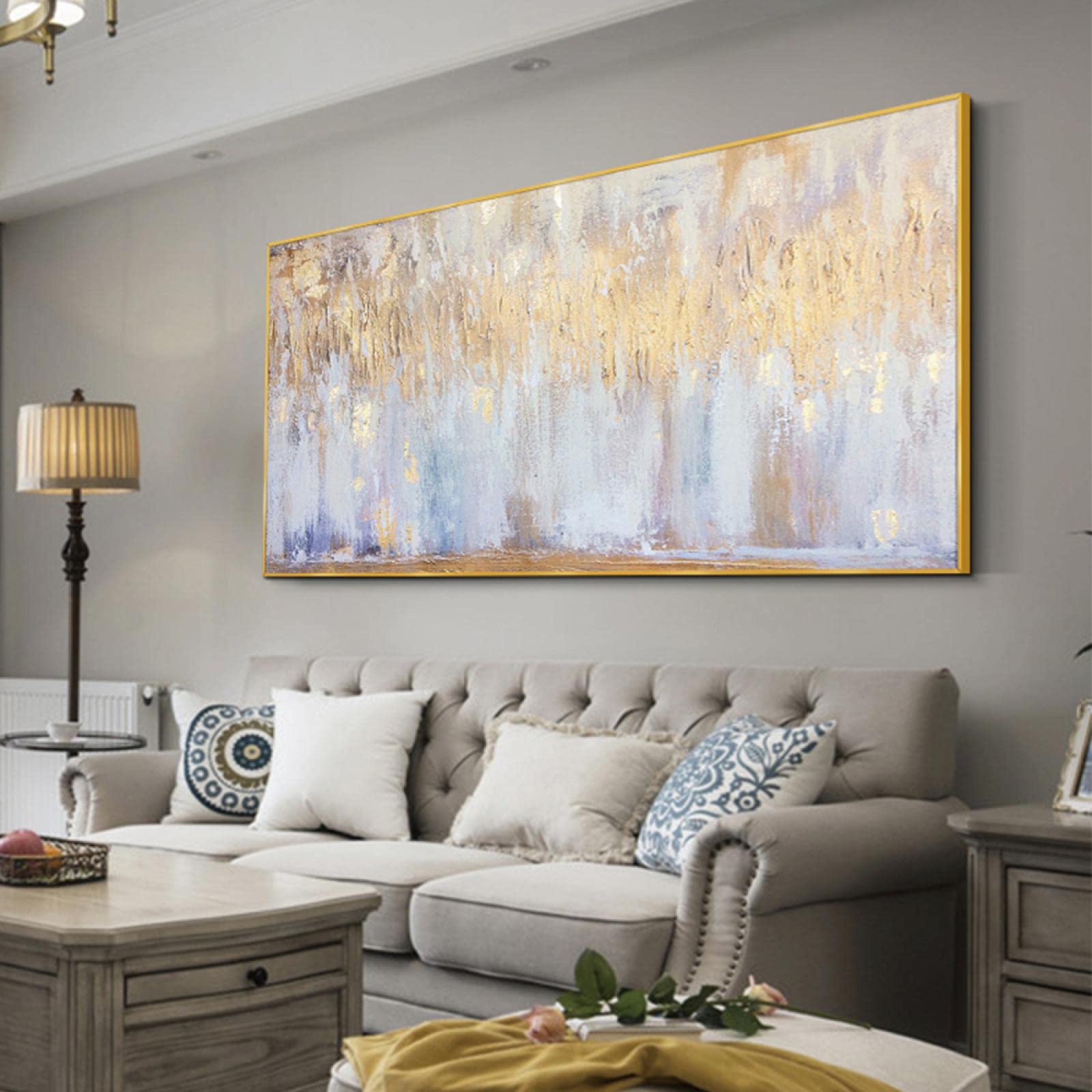Suchst du was Großes für deine Wand? Dieses XXL Leinwandbild in 140x80 cm wird zum absoluten Hingucker! Das abstrakte Design in Weiß und Gold passt super in moderne Wohnungen - ob skandinavisch, Loft-Stil oder industrial. \n\nHochwertiger Giclée-Druck auf Baumwoll-Leinwand (340 g/m²) - die Farben bleiben auch bei Sonneneinstrahlung lange frisch. UV-beständig, kratzfest und mit matter Oberfläche, die nicht blenden. \n\nOhne Rahmen kommt moderner Chic rüber - die bedruckten Seitenkanten geben dem Ganzen noch mehr Tiefe. Installation ist easy: Einfach aufhängen und fertig! \n\nPerfekt für über's Sofa, im Flur oder im Schlafzimmer. Und als Geschenk? Absolute Bombe! Hochzeiten, Geburtstage, Einzug - damit machst du immer eine gute Figur. \n\nDie Lieferung kommt sicher verpackt in stoßfestem Karton an. Falls doch mal was sein sollte: Umtausch ist kein Problem. Hol dir diesen Eyecatcher - deine Wände werden sich freuen!