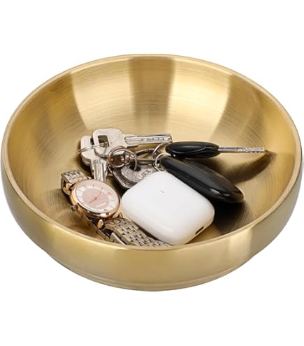 Diese wunderschöne goldene Edelstahl-Schale ist ein echter Hingucker für dein Zuhause! Mit 18cm Durchmesser und 6,5cm Höhe bietet sie genug Platz für Schlüssel, Schmuck, Münzen oder auch Snacks. Hochglanzpoliert und mit gebürsteter Oberfläche sieht sie einfach edel aus. Die glatten Kanten und die rutschfeste Basis mit Rippen sorgen für Stabilität. Perfekt für den Eingangsbereich, Wohnzimmer, Schlafzimmer oder sogar die Bar - sie passt sich jedem Einrichtungsstil an. Ob als praktische Schlüsselablage, elegante Schmuckpräsentation oder stylische Servierschale für Gäste - dieses Teil ist einfach vielseitig. Und das Beste: Reinigen geht ratzfatz mit einem feuchten Tuch. Ein tolles Geschenk für alle, die Wert auf Ordnung und Stil legen!