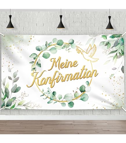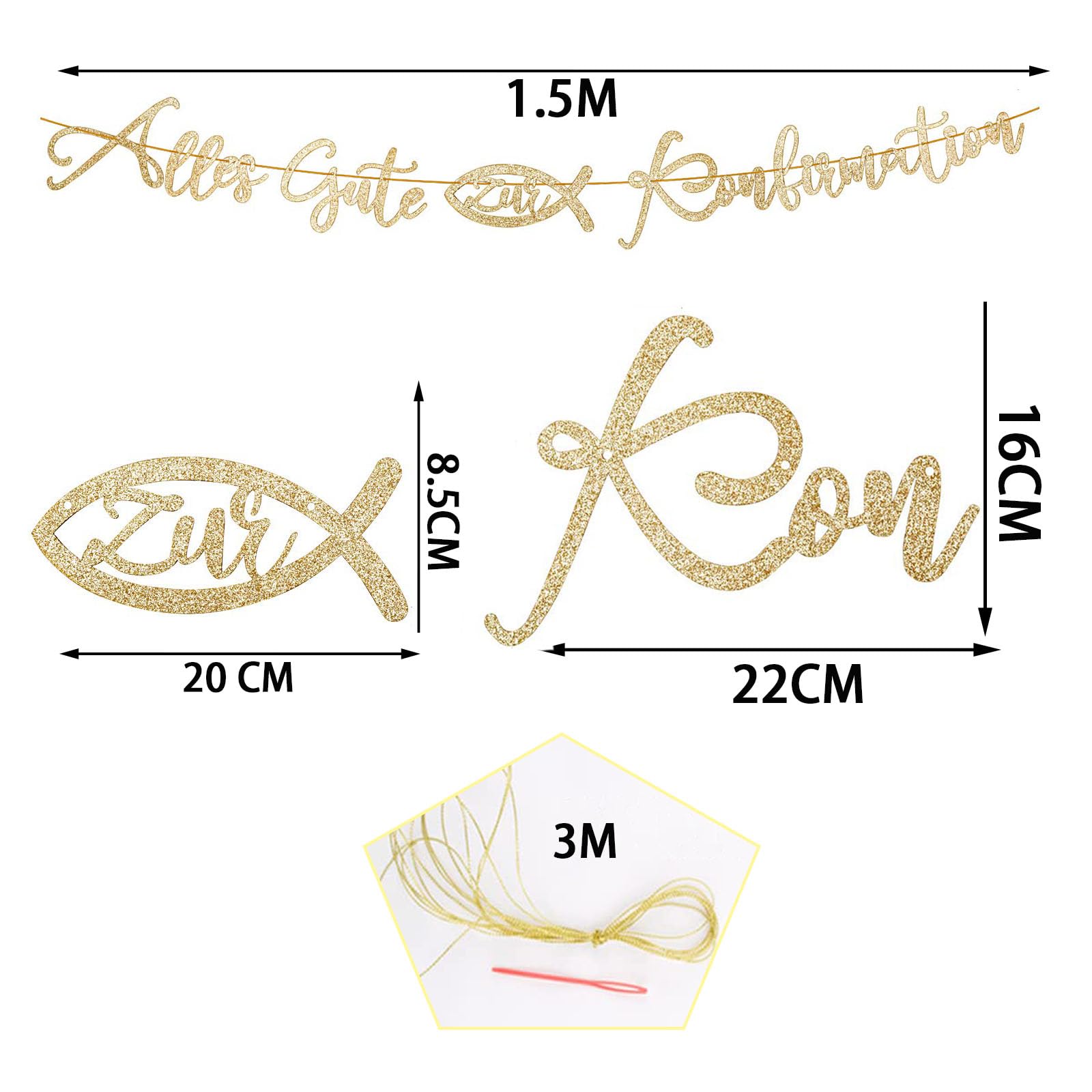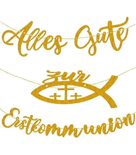 Mach die Kommunion oder Taufe deines Kindes zu einem unvergesslichen Fest! Diese wunderschöne Gold-Girlande mit Glitzer-Effekt sorgt für die perfekte festliche Atmosphäre. Im Set enthalten: 1x \Alles Gute zur Konfirmation\ Banner, 24x Windlicht-Fisch Torten-Deko und 1x Konfirmation Kuchen-Deko.