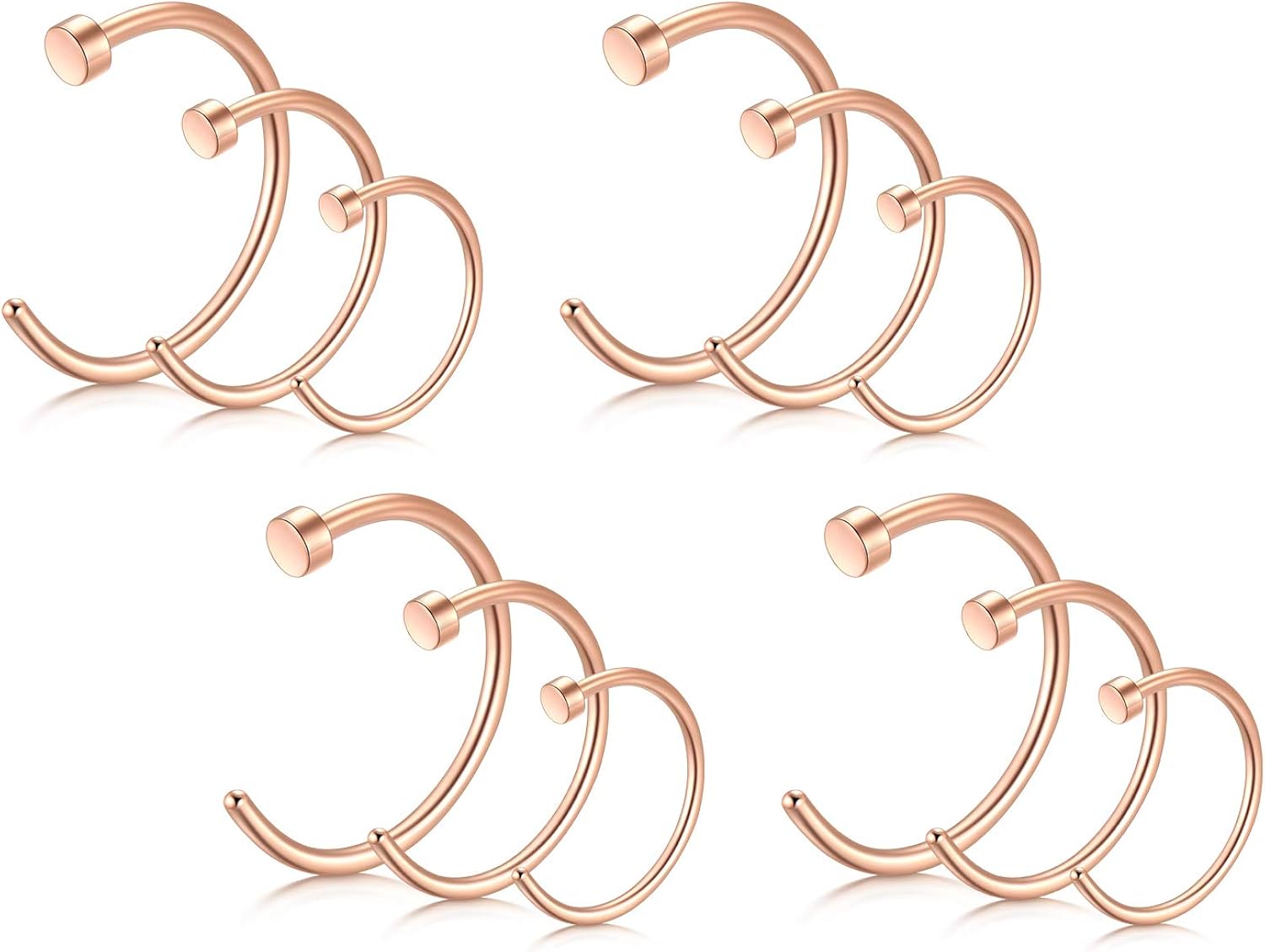 Wow, dieses Nasenpiercing-Set ist ja richtig umfangreich! Du kriegst 14 Teile - 6 Nasenringe und 8 Nasenstecker in verschiedenen Größen. Alle aus 316L Chirurgenstahl, teilweise mit 14K Gold beschichtet, also hypoallergen und perfekt für empfindliche Haut. Die Stärken sind 18G (1,0mm) und 20G (0,8mm), die Nasenringe haben 8mm Innendurchmesser. Mit funkelnden Zirkonia-Steinen in 1,5mm bis 3mm Größe - das glitzert richtig schön! Aber das Tolle: Die Teile kannst du nicht nur für Nasenpiercings verwenden, sondern auch für Ohr-Piercings wie Helix, Tragus, Conch oder sogar als Lippenring! Die Oberfläche ist super glatt poliert, keine scharfen Kanten die drücken. Ob du nun nen dezenten Stecker willst oder nen auffälligen Ring - in diesem Set ist für jeden Style was dabei. Perfekt als Geschenk für Piercing-Fans oder um deine eigene Sammlung zu erweitern. Sieht teuer aus, ist aber erschwinglich - was will man mehr?