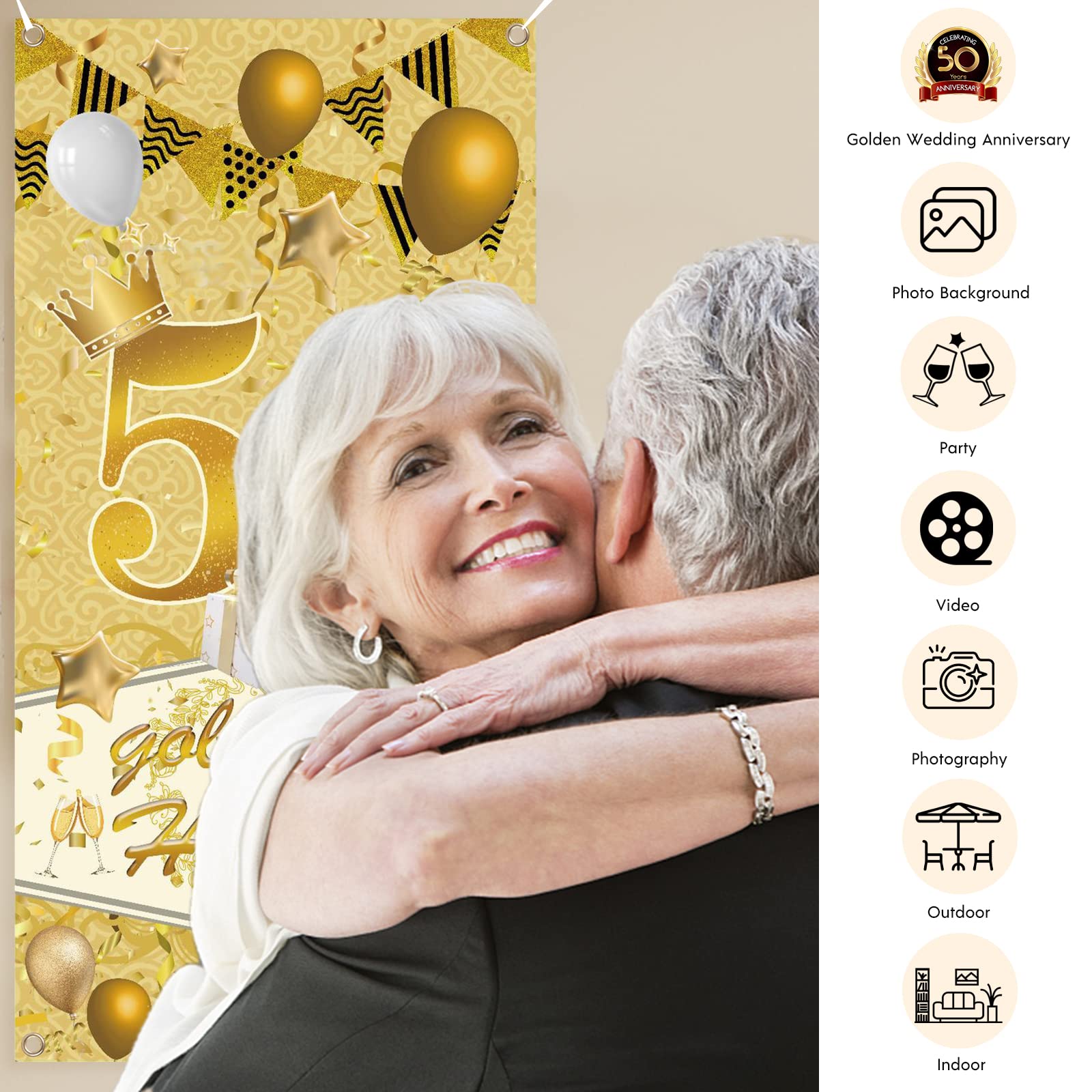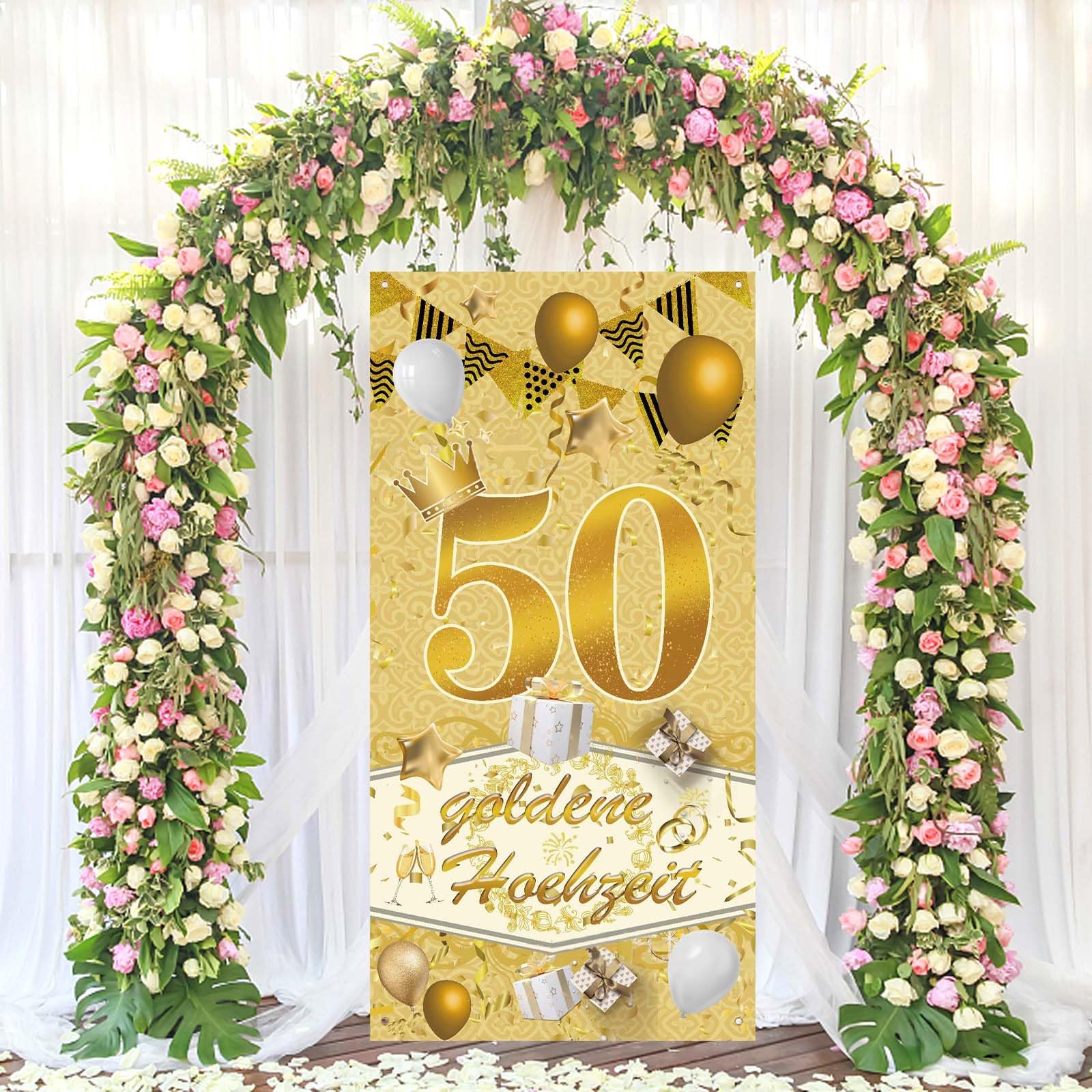 50 Jahre zusammen - das muss gefeiert werden! Mit diesem 3 Meter langen Glitzer-Banner wird die Goldhochzeit zum absoluten Highlight. In edlem Gold mit der Aufschrift '50 Jahre Hochzeitstag' sorgt es für die perfekte Feststimmung. Aus stabilem Glitzer-Karton, einfach mit dem beiliegenden Seidenband aufzuhängen. Ob im Saal, Garten oder Wohnzimmer - dieser Banner macht überall was her. Die Buchstaben kannst du frei anordnen, je nach verfügbarem Platz. Sieht nicht nur super aus, sondern ist auch langlebig. Der ideale Deko-Hingucker für das besondere Jubiläum, der allen Gästen sofort ins Auge fällt!