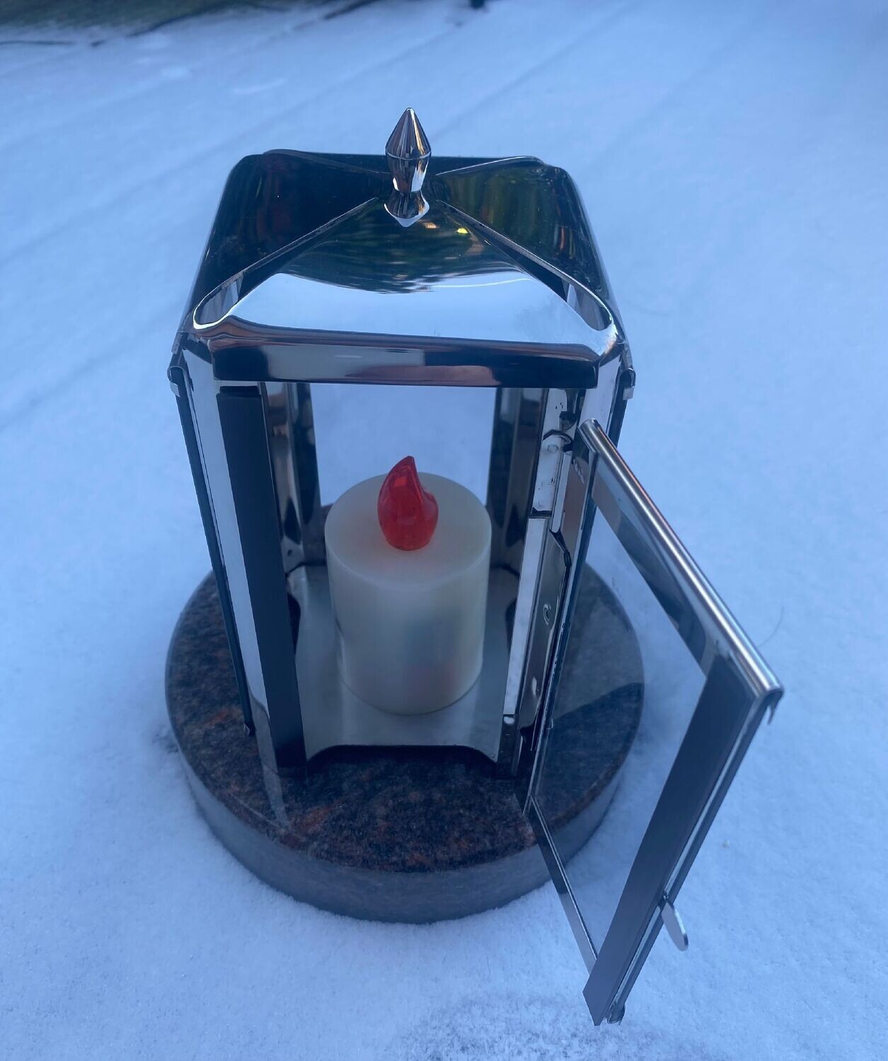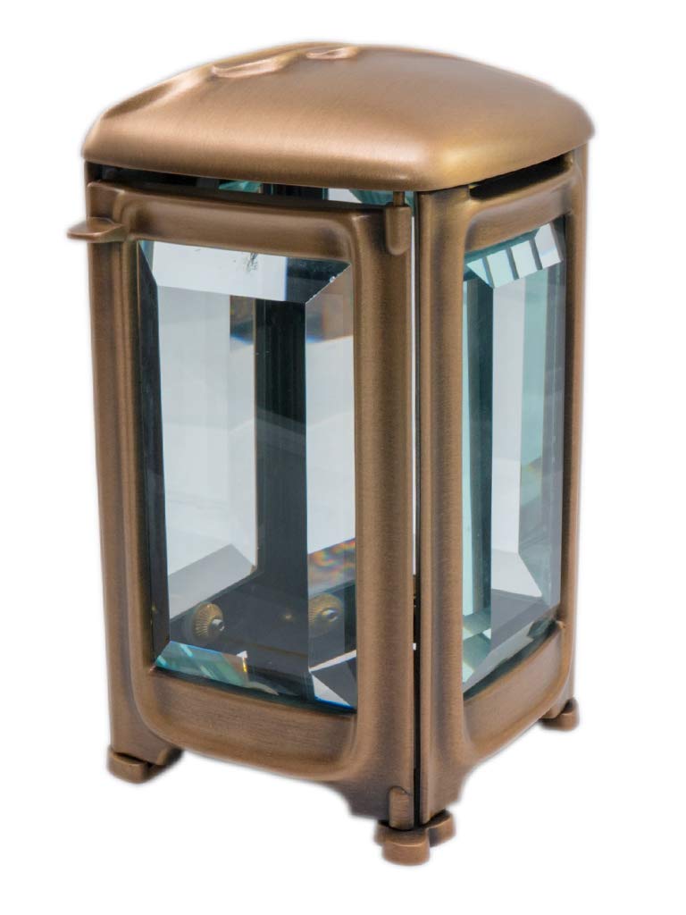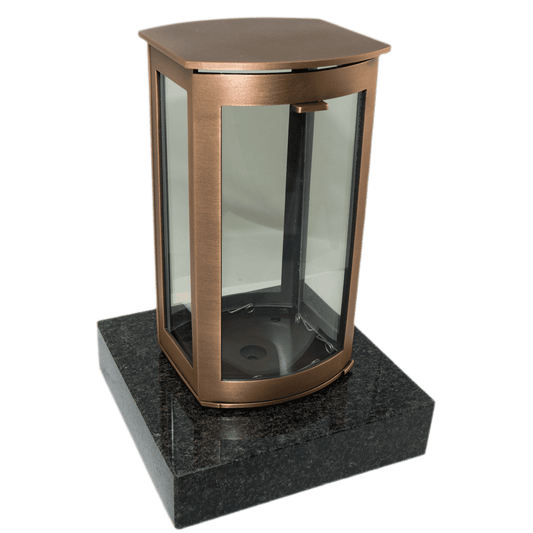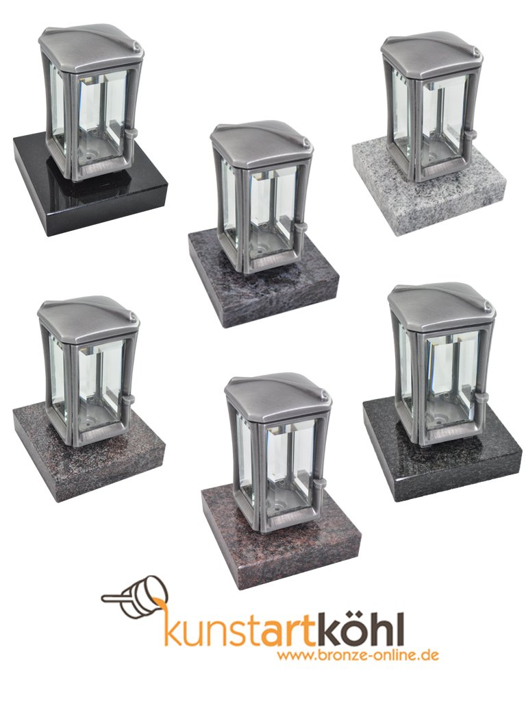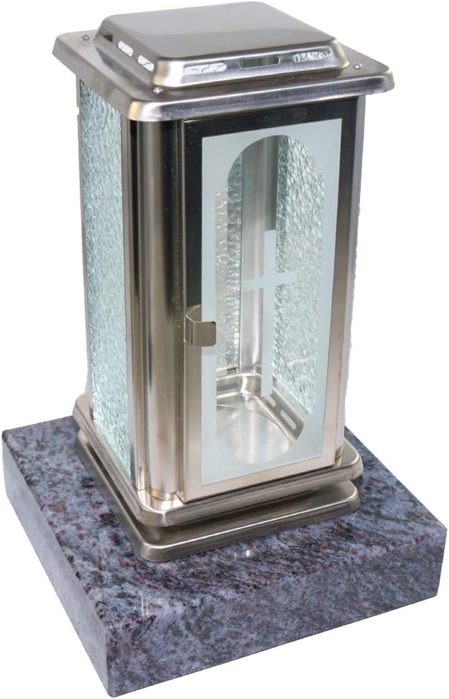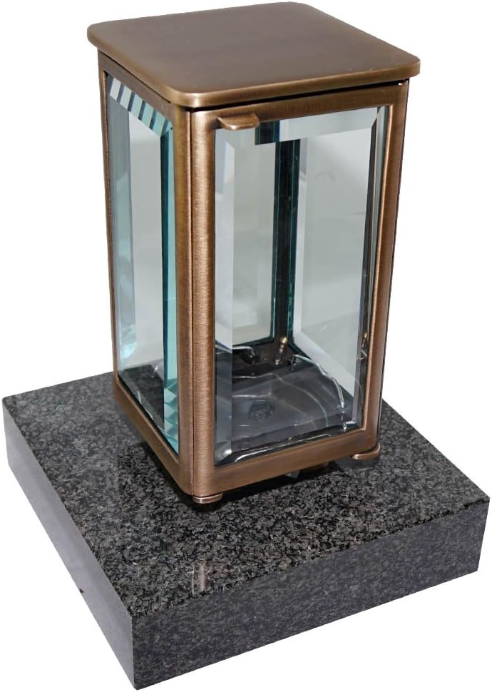 Diese wunderschöne Grablaterne von Kunst-Art-Köhl ist ein wirklich würdevolles Accessoire für die letzte Ruhestätte. Aus hochwertigem Messing im Sandgussverfahren von Hand vergossen und bearbeitet - jede Laterne ein Unikat. Montiert auf einem polierten Granitsockel Himalaya mit den Maßen 17x17x4cm. Die Gesamthöhe beträgt 23cm, die Laterne selbst ist 19cm breit, 10cm tief und 10cm hoch. Die Facettenglasscheiben sind einzeln austauschbar und können bei Bedarf nachbestellt werden. Praktisch: Die Laterne wird bereits fertig montiert geliefert - einfach aufstellen und sie ist einsatzbereit. Geeignet für 1-3 Tages Grabkerzen sowie LED Grablichter. Eine Grabkerze von Aeterna wird sogar mitgeliefert! Wichtig: Verwende am besten Kerzen aus reinem Pflanzenöl, da Billigkerzen aggressive Säuren freisetzen können. Die Laterne ist mit einem Speziallack geschützt und behält so lange ihr schönes Aussehen. Ein wirklich hochwertiges Produkt für eine würdevolle Grabstätte.