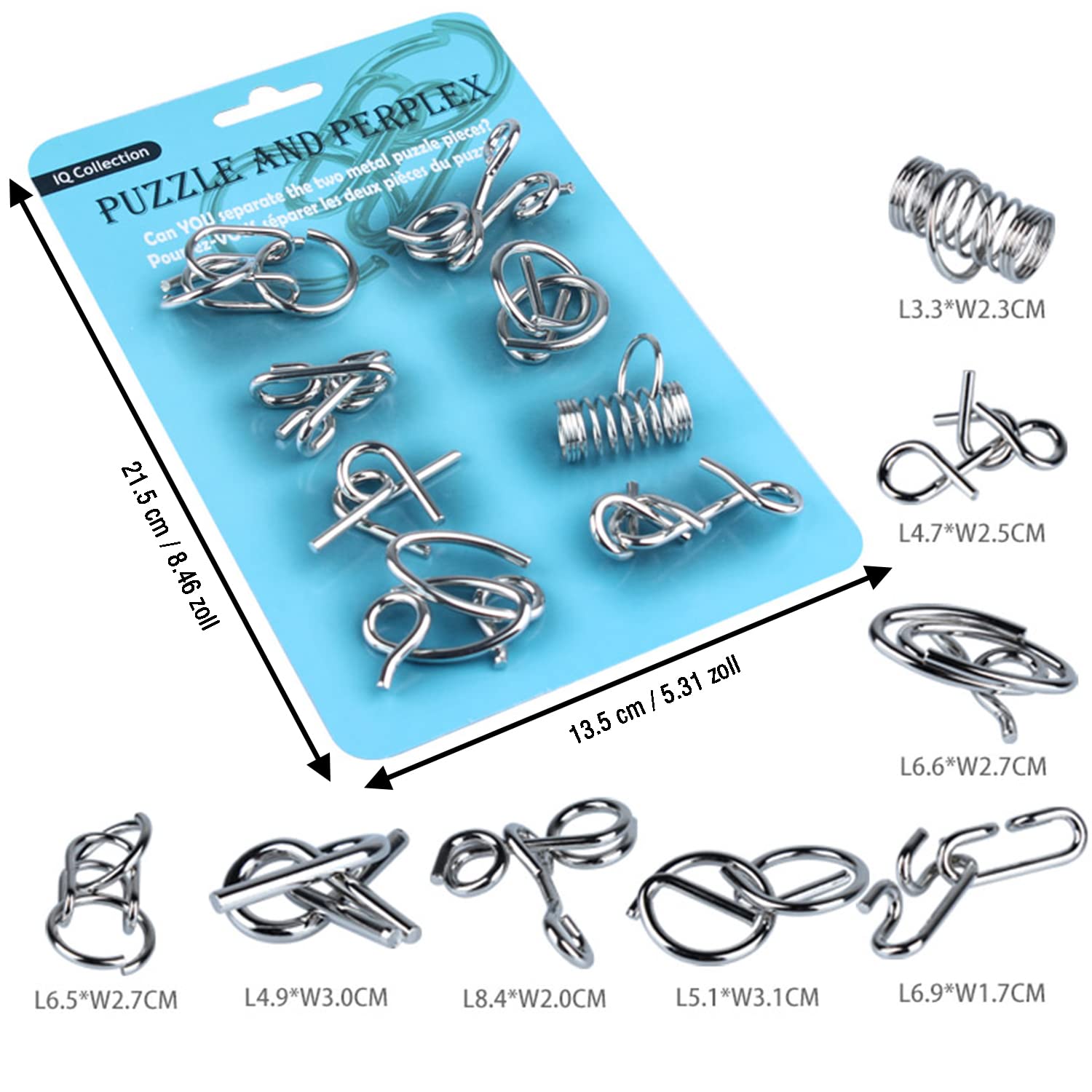 Diese 12 Metall-Puzzles fordern dein Gehirn richtig heraus! Jedes Puzzle einzigartig, muss auseinander genommen und wieder zusammengesetzt werden. Aus umweltfreundlichem Gusseisen, ca. 5x4cm groß - handlich und überall mitnehmbar. Perfekt für Kinder ab 15 Jahren und Erwachsene. Trainiert logisches Denken und Feinmotorik. Super gegen Langeweile oder zum Abschalten vom Alltagsstress. Ideal für Familien-Spieleabende oder als Geschenk für Puzzle-Fans. Macht süchtig - wenn man erstmal anfängt, will man nicht mehr aufhören! Einfach ausprobieren und sich herausfordern lassen!