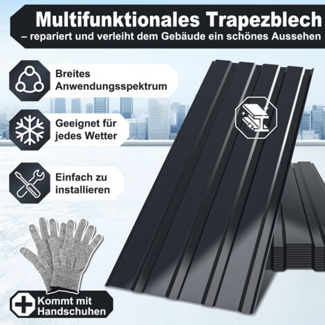 Aus verzinktem Stahl mit spezieller Beschichtung sind die Platten wetterfest, rostfrei und halten auch starkem Regen und UV-Strahlung stand. Die praktische Trapezform sorgt für hohe Stabilität und leitet Wasser optimal ab. Vorgebohrte Löcher erleichtern die Montage erheblich.