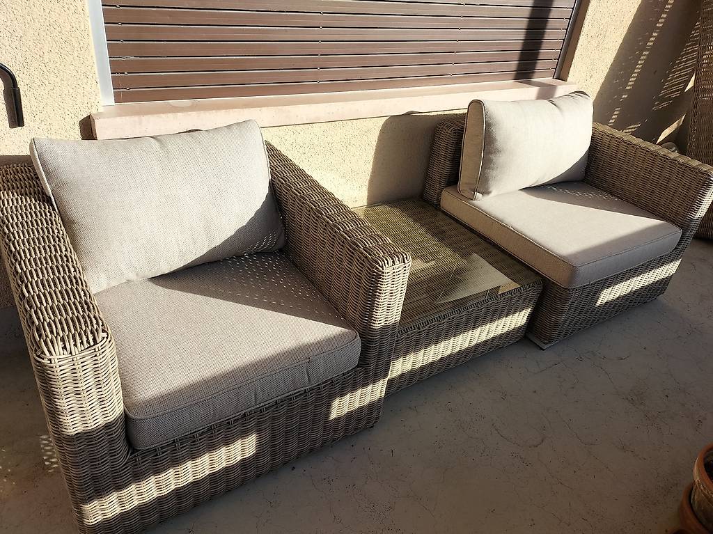 Das perfekte Lounge-Set für deine Terrasse! Dieses graue Rattan-Set besteht aus einem 2-Sitzer Sofa mit verstellbarer Rückenlehne und einem praktischen Hocker. Der Clou: Der Hocker kann als Beistelltisch genutzt werden - einfach Kissen abnehmen! Super bequem mit den dick gepolsterten Kissen und der 120x74 cm großen Sitzfläche. Noch mehr praktisch: Der Hocker hat Stauraum innen und kann unter das Sofa geschoben werden - platzsparend für kleine Balkone! Die Seitenablagen sind perfekt für Getränke. Aus wetterfestem Stahlrohr mit Rostschutz, Rattan und Akazienholz - hält auch bei Regen stand. Maße Sofa: 120x74x95 cm, Hocker: 101x58x36 cm. Inklusive 2 Deko-Kissen für extra Komfort. Einfach aufbauen und den Sommer genießen! Material: Stahlrohr, Rattan, Akazienholz | Farbe: Grau | Maße Sofa: 120x74x95 cm | Maße Hocker: 101x58x36 cm | Mit Stauraum | Verstellbare Rückenlehne