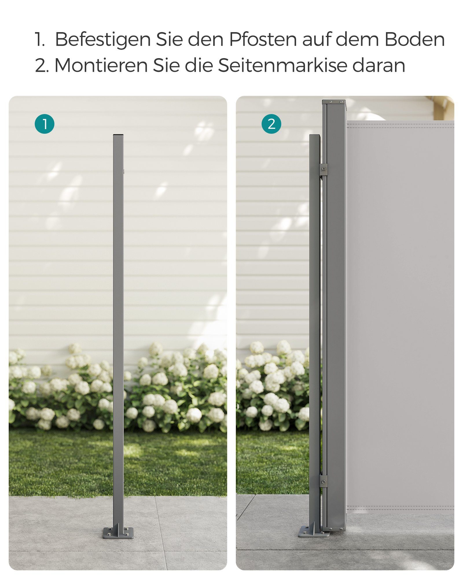 Endlich leichtes Öffnen und Schließen deiner Seitenmarkise! Dieser praktische Griff aus hochwertigem Kunststoff macht's möglich. In grau - rostet nicht und sieht schick aus. Einfach zu installieren: Eine Seite der Markise an der Wand befestigen, Pfosten am Boden - und schon kann's losgehen. Mit dem Griff lässt sich der Sichtschutz leicht öffnen und einfahren. Das ausziehbare Design ist super platzsparend - bei Nichtgebrauch einfach verstauen. Die starke Feder sorgt für reibungslosen Betrieb. Perfekt für Balkon, Terrasse, Schwimmbad, Garten oder sogar Bürofenster. Schafft im Handumdrehen eine private Atmosphäre, wenn du sie brauchst - und ist schnell wieder weg, wenn du freie Sicht willst. Ein kleines Teil, das einen großen Unterschied macht!