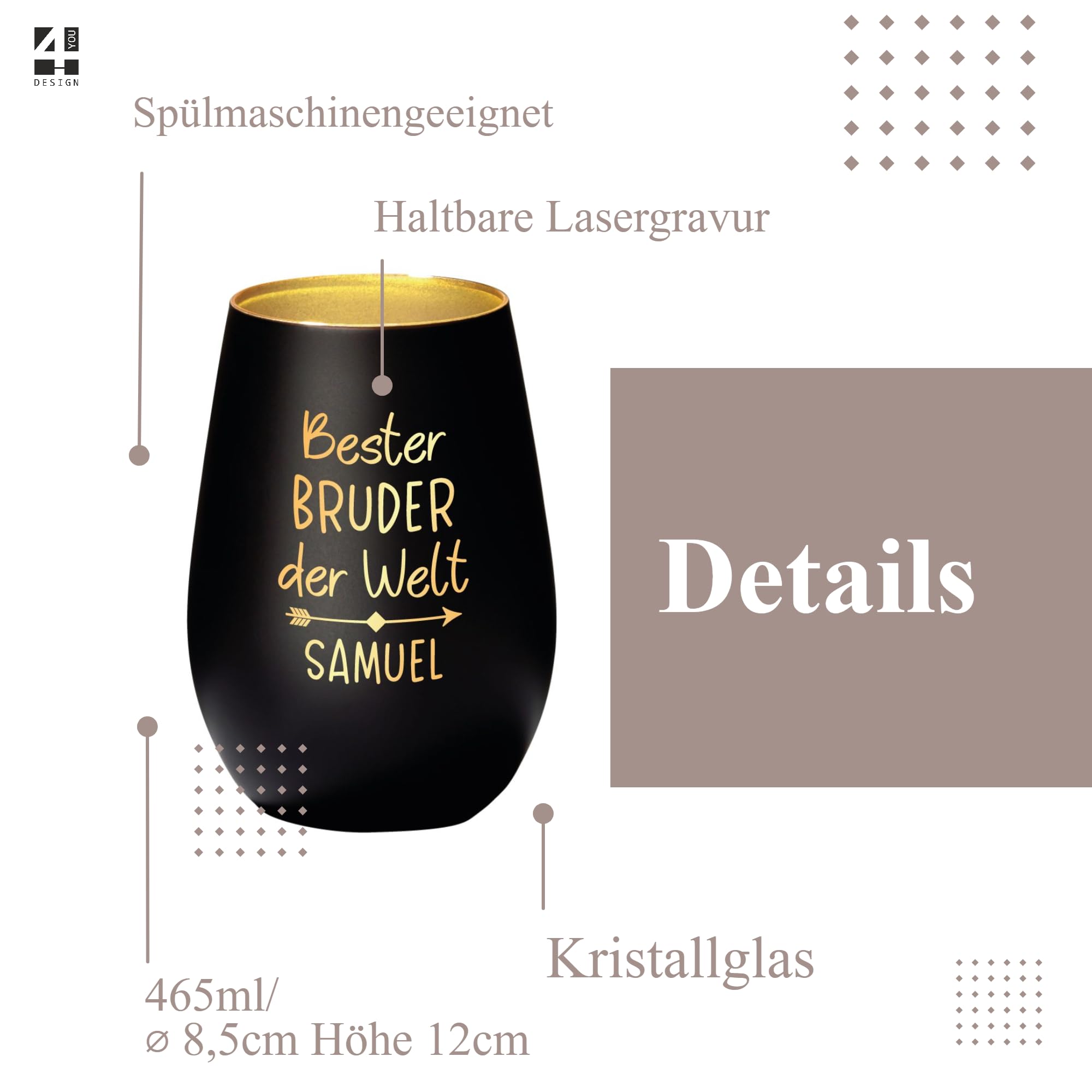 Wow, dieses Windlicht ist einfach wunderschön! Aus hochwertigem Glas in bauchiger Form, 12 cm hoch und 8,5 cm Durchmesser. Mit der berührenden Gravur 'Es gibt Menschen, die passen einfach perfekt ins Herz, so wie du' und zarten Herzmotiven. Erhältlich in drei eleganten Farbkombinationen: Schwarz-Gold, Weiß-Gold oder Weiß-Silber. Jedes Stück wird mit Liebe per Lasergravur personalisiert - die Gravur ist dauerhaft und verblasst nie. Spülmaschinengeeignet und mit ca. 465 ml Fassungsvermögen. Perfekt als Dankeschön, Geburtstagsgeschenk oder einfach als liebevolle Aufmerksamkeit für Menschen, die dir am Herzen liegen. Das warme Kerzenlicht verbreitet Geborgenheit und deine Worte strahlen im zarten Licht - einfach magisch!