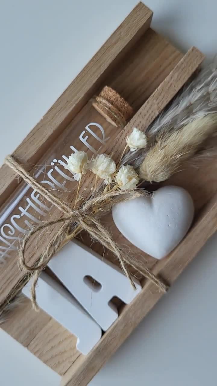 Geld schenken war noch nie so schön! Das LUMOOM Holzherz verwandelt langweilige Geldscheine in ein echtes Erinnerungsstück. Das filigrane Doppelherz-Design aus Holz sieht nicht nur toll aus, sondern ist auch richtig gut verarbeitet. Mit den vier beiliegenden Messingschrauben machst du die Geldscheine sicher im Herz fest - kein Falten, kein Knittern, einfach perfekt präsentiert. Auf der Rückseite hast du Platz für persönliche Wünsche und Grüße - so wird aus dem Geldgeschenk eine bleibende Erinnerung für das Brautpaar. Und das Beste: Nach der Hochzeit wird das Holzherz nicht weggeworfen, sondern kann mit dem mitgelieferten Ständer als Deko im Zuhause der Frischvermählten stehen. Perfekt nicht nur für Hochzeiten, sondern auch für Geburtstage, Jubiläen oder andere besondere Anlässe. Das Holzherz kommt in einer dezenten Holzfarbe und misst 16x11cm - also genau die richtige Größe, um auf dem Geschenketisch richtig was herzumachen. Schenk mal was, was in Erinnerung bleibt!