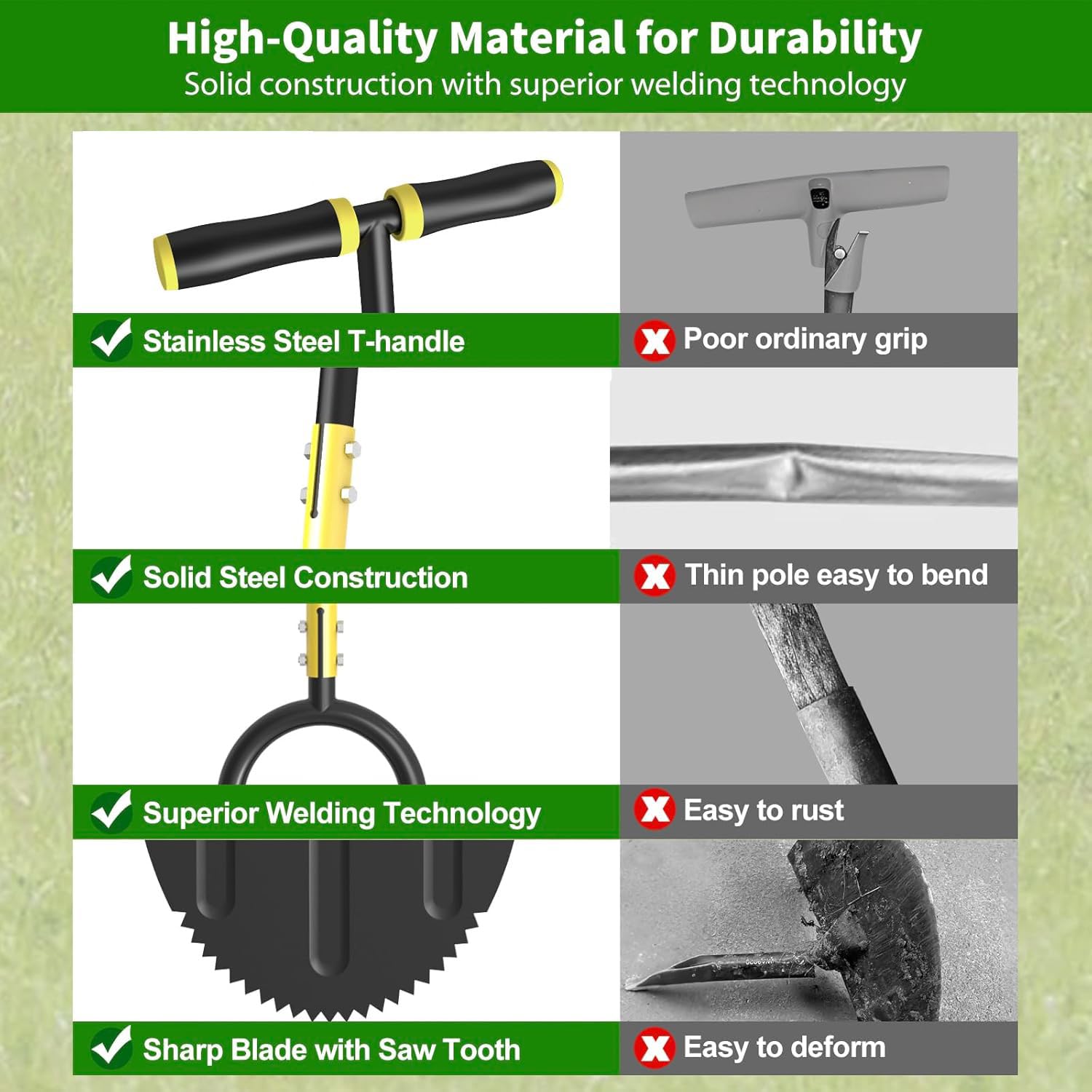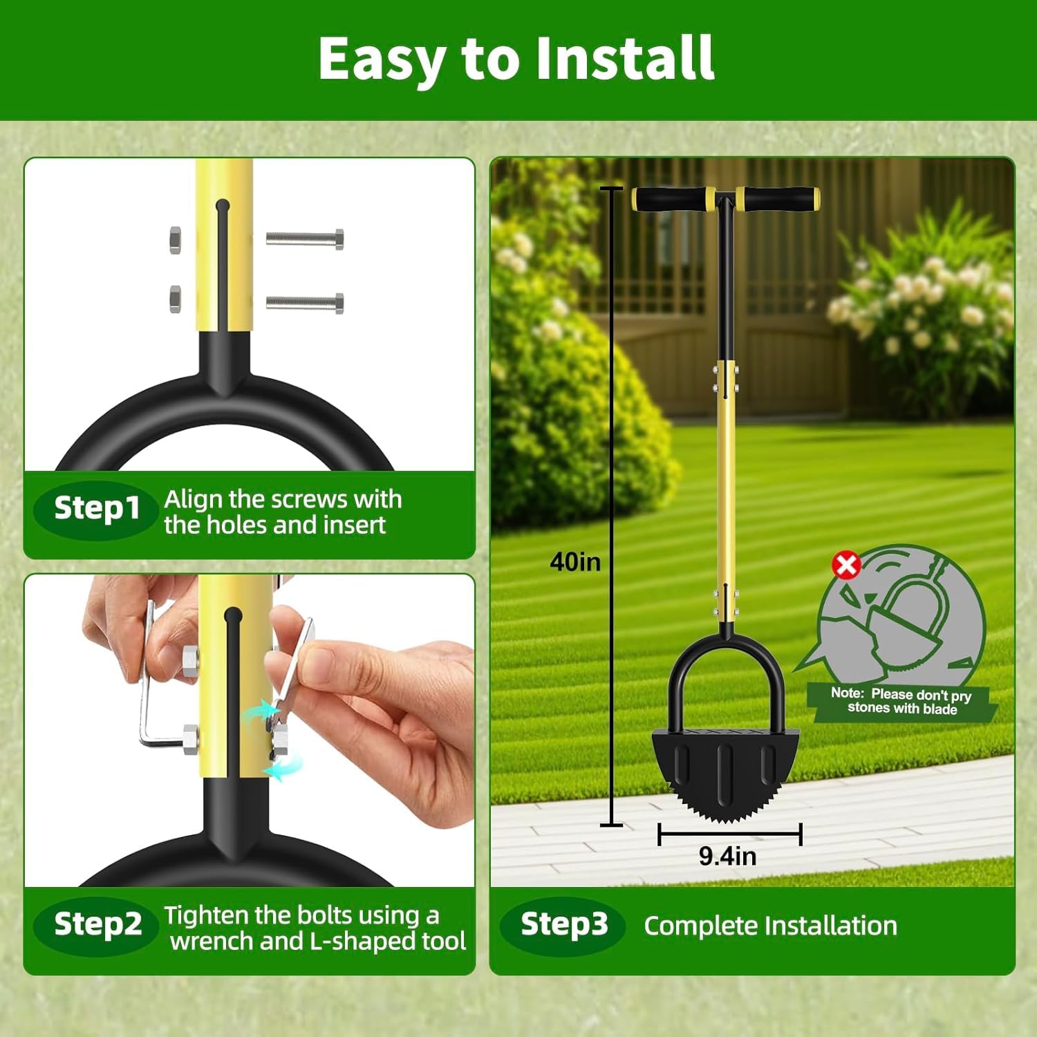 Perfekte Rasenkanten ganz ohne Rückenweh! Dieser Halbmond-Rasenkantenstecher mit scharfer Sägezahnklinge schneidet mühelos durch Gras und Erde. So entstehen saubere, gerade Kanten entlang von Gehwegen, Beeten und Einfahrten.\n\nDer verstellbare Griff von 96-124cm lässt sich genau auf deine Körpergröße anpassen. Du kannst im Stehen arbeiten - kein Bücken oder Knien mehr nötig! Der ergonomische T-Griff gibt dir zusätzlichen Halt und Kontrolle.\n\nDie breite Fußplatte ermöglicht es, mit dem Körpergewicht zu arbeiten - so kommst du auch in härtere Böden problemlos rein. Aus robustem, rostbeständigem Metall gefertigt, hält dieses Werkzeug viele Jahre.\n\nEinfach montiert - alle benötigten Teile und Werkzeug liegen bei. Perfekt für Hobbygärtner und Profis, die Wert auf akkurate Rasenkanten legen.\n\nMach deinen Garten zum Vorzeigeobjekt - mit professionellen Kanten! 🌿✂️