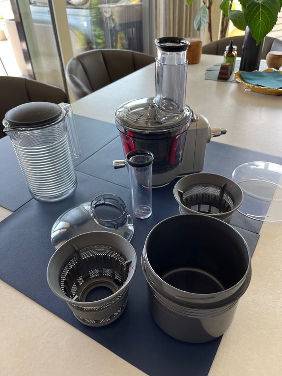 Frischgepresste Säfte, aber bitte mit allen Nährstoffen! Dieser Kau-Entsafter mit 350W Leistung presst dein Obst und Gemüse langsam und schonend - so bleiben die ganzen Vitamine erhalten. \\n\\nDas Coole: Die Rutsche ist mit 140mm richtig groß, da passt fast ganzes Obst rein! Kein langes Schneiden vorher, einfach rein und entsaften. Und weil keine scharfen Klingen drin sind, ist das auch viel sicherer - besonders mit Kindern im Haus. \\n\\nReinigen ist kein Drama: Mit dem beiliegenden Pinsel bist du in 5 Minuten fertig. Und falls mal was nicht klappt: Einfach checken, ob der Deckel richtig sitzt und der Griff zum Startknopf passt. Dann läuft's! Perfekt für gesunde Säfte ohne Nährstoffverlust.