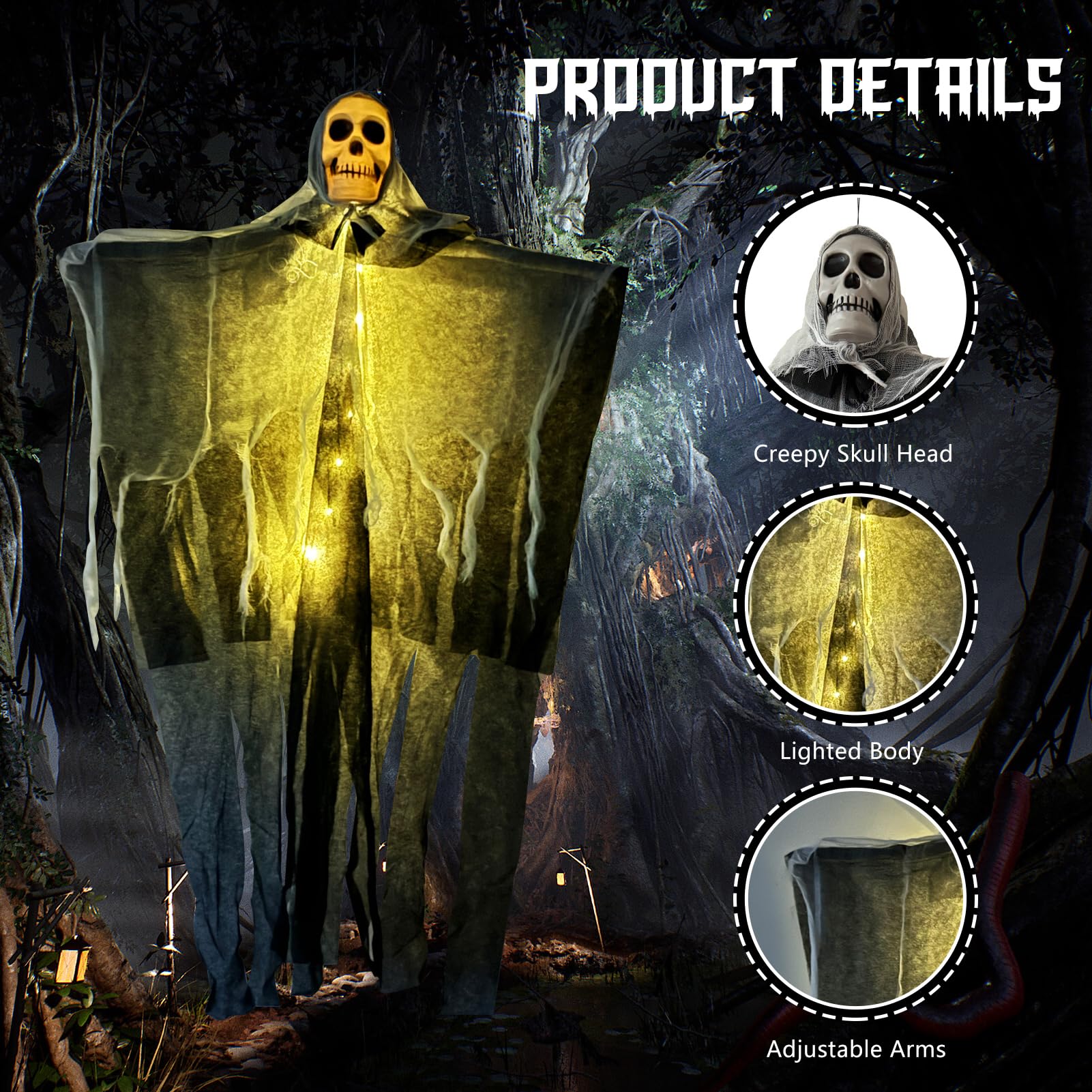 Perfect für gruselige Halloween-Stimmung! Dieses 80cm große Skelett mit Geist-Effekt und LED-Beleuchtung macht jede Party unheimlich. Aus ABS-Kunststoff und Baumwollgarn, mit beweglichen Armen für verschiedene Posen. Einfach aufhängen - ob im Garten, an der Tür oder im Haus. Die LED-Beleuchtung sorgt für die richtige Grusel-Atmosphäre. Schock deine Gäste mit dieser authentischen Halloween-Deko!