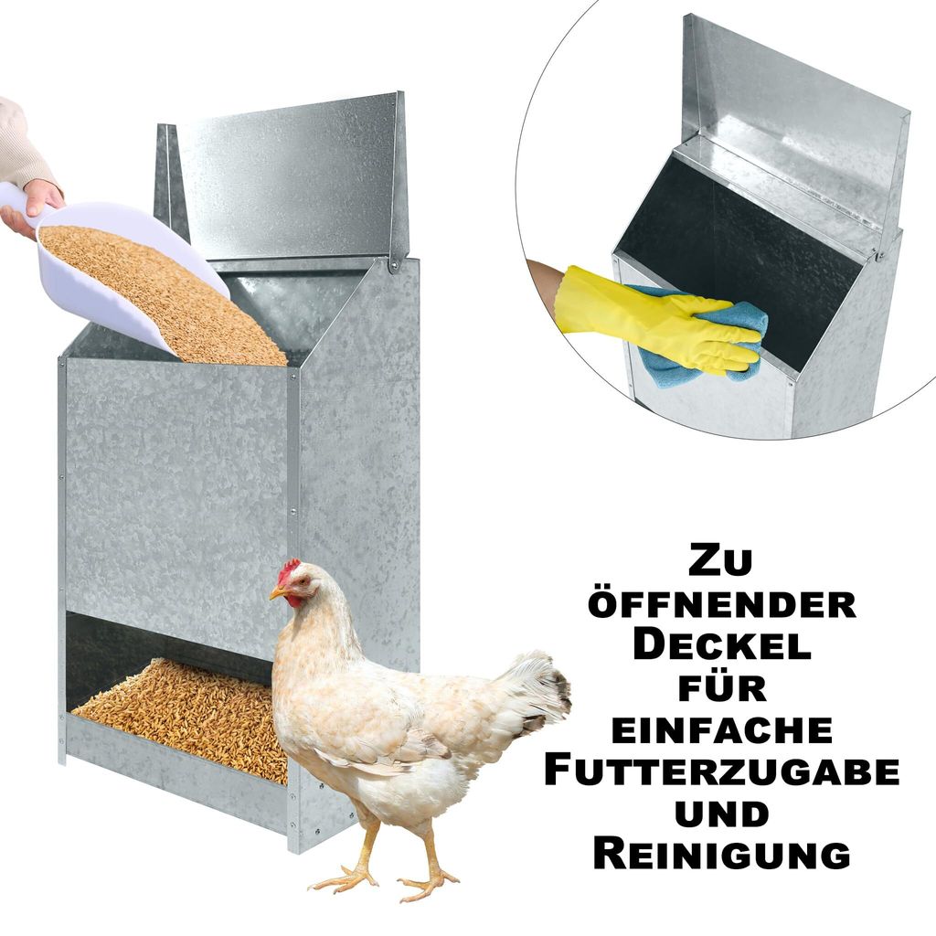 Perfekte Fütterung für deine Hühner! Dieser Zootec Futterautomat mit 9kg Fassungsvermögen macht die Fütterung sauber und effizient. Das Anti-Press-Gitter verhindert, dass die Hühner Futter herausschmeißen - so sparst du Futter und hältst den Stall sauber.\\n\\nIch nutze den Spender seit einem Jahr und bin begeistert! Die drei Einstelllöcher ermöglichen verschiedene Futterstände. Die 65mm hohen Füße halten das Futter sauber und machen die Fütterung für die Tiere bequemer.\\n\\nAus robustem Kunststoff, Made in Italy. Kann aufgehängt oder aufgestellt werden. Einfach zusammenbauen (nur 3 Teile), befüllen und deine Hühner sind versorgt. Perfektes Zubehör für jede Hühnerhaltung!