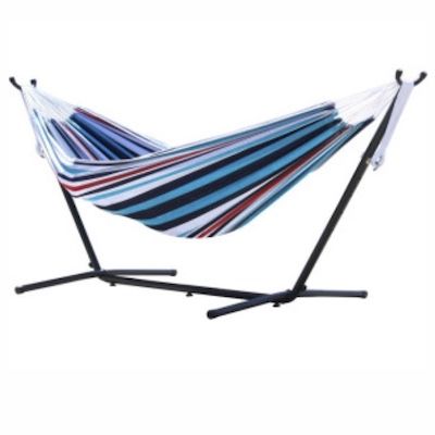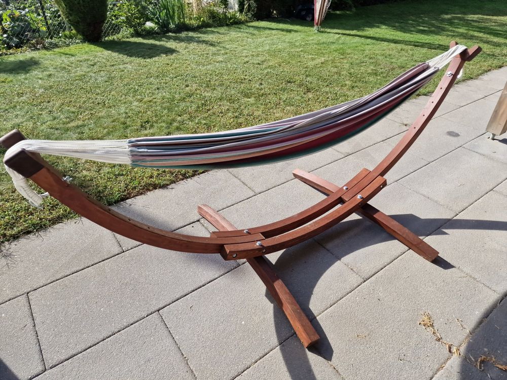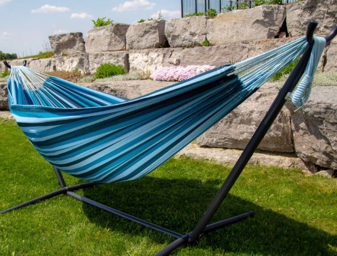 Entspannung pur - ganz ohne Bäume! Diese Vivere Hängematte mit Gestell ist dein persönlicher Ruhepol im Garten. Der spezielle Sunbrella-Stoff ist super wetterfest - hält Schmutz, Schimmel und UV-Strahlen stand. Das Stahlgestell ist bombenstabil und in Minuten ohne Werkzeug aufgebaut. Für zwei Personen geeignet, 8 Fuß (ca. 2,4m) lang. Mit verstellbaren Haken bestimmst du selbst, wie tief du liegen möchtest. Inklusive praktischer Tragetasche für unterwegs. Perfekt für Nickerchen in der Sonne!