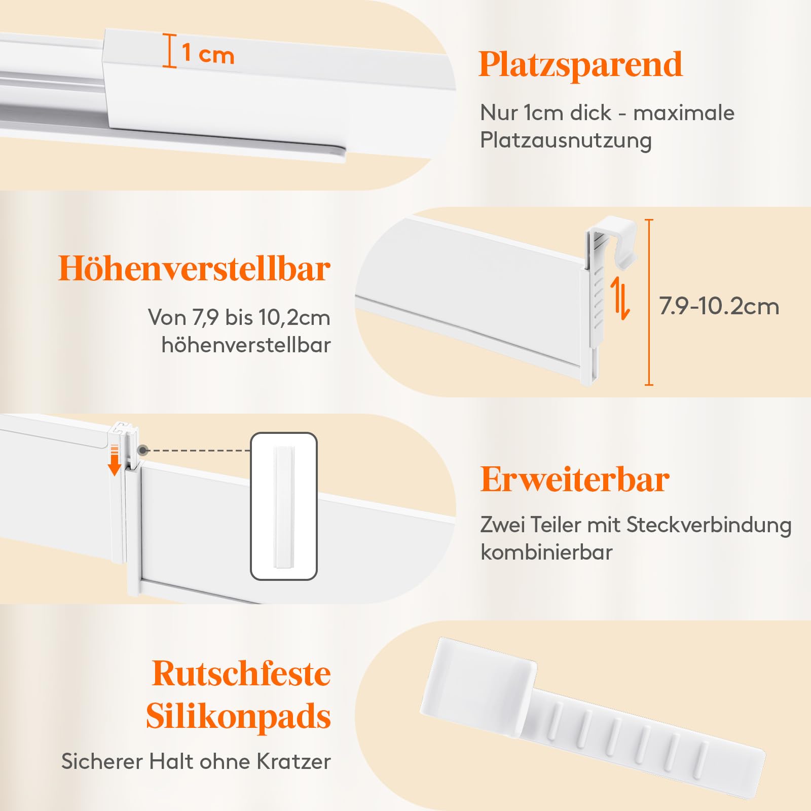 Endlich Ordnung in der Schublade! Diese 4 verstellbaren Schubladentrenner von Lifewit sind die Lösung gegen das Chaos. Mit 7,9-10,2 cm Höhe und 25,3-42,9 cm Länge passen sie in fast jede Schublade. Einfach an den Seitenwänden einklemmen - keine Montage nötig! Die rutschfesten Silikonauflagen schützen deine Schubladen vor Kratzern. Perfekt für die Küche (Gewürze, Besteck), Bad (Kosmetik), Büro (Stifte, Kleinkram) oder Wohnzimmer. Du kannst die Trenner beliebig kombinieren und sogar miteinander verbinden für größere Fächer. Aus stabilem ABS-Kunststoff - hält sicher und wackelt nicht. Mach aus einer unordentlichen Schublade ein perfekt organisiertes System. Einfach genial!